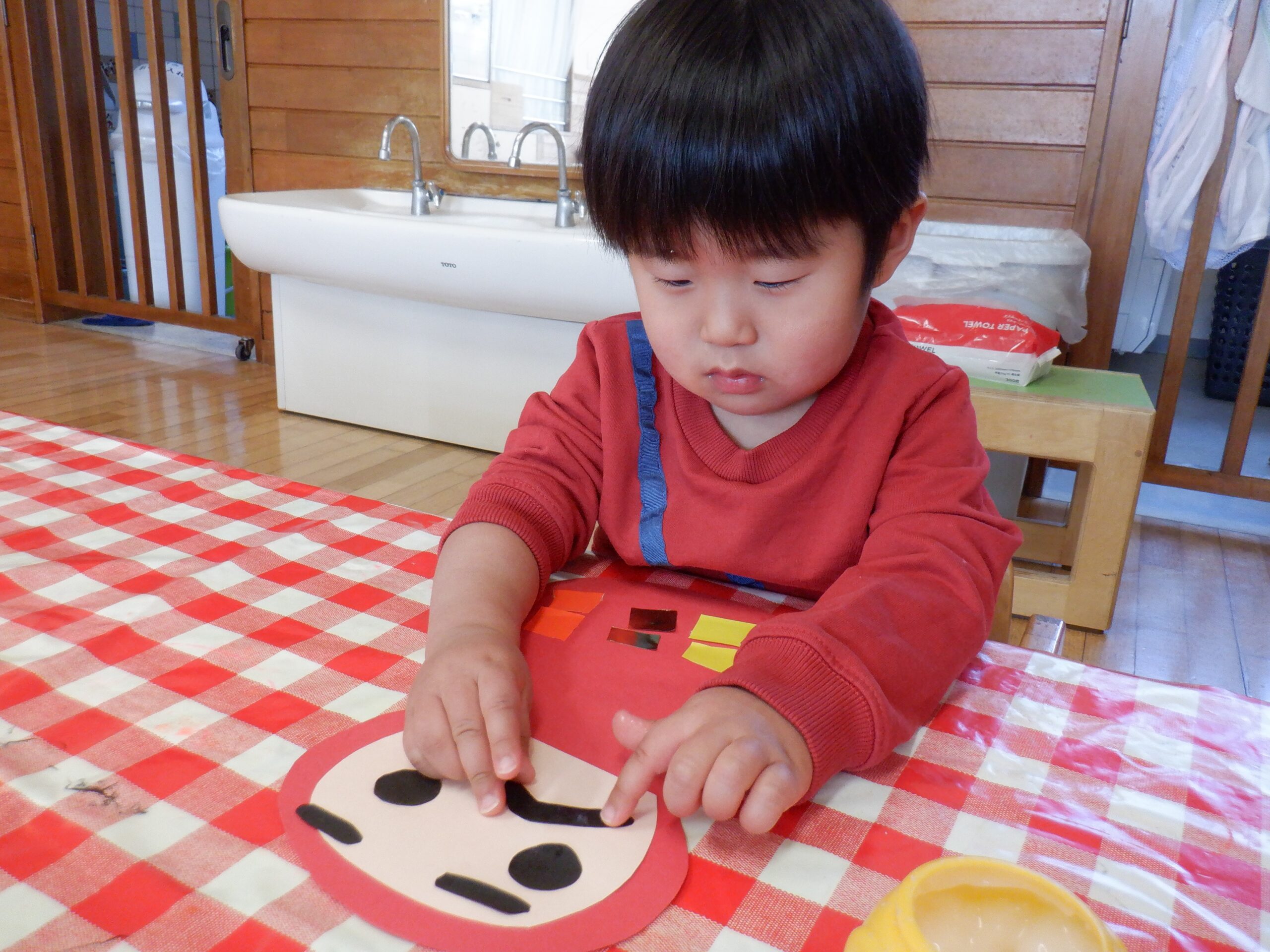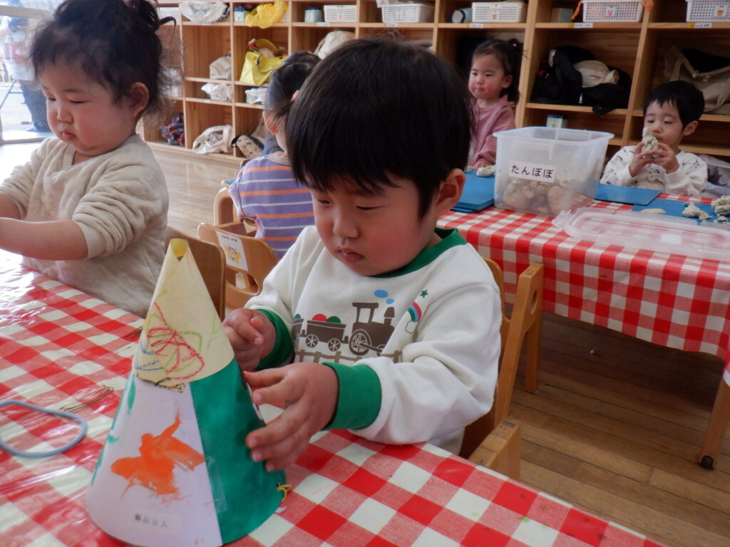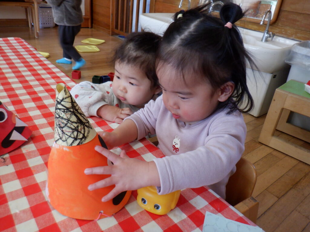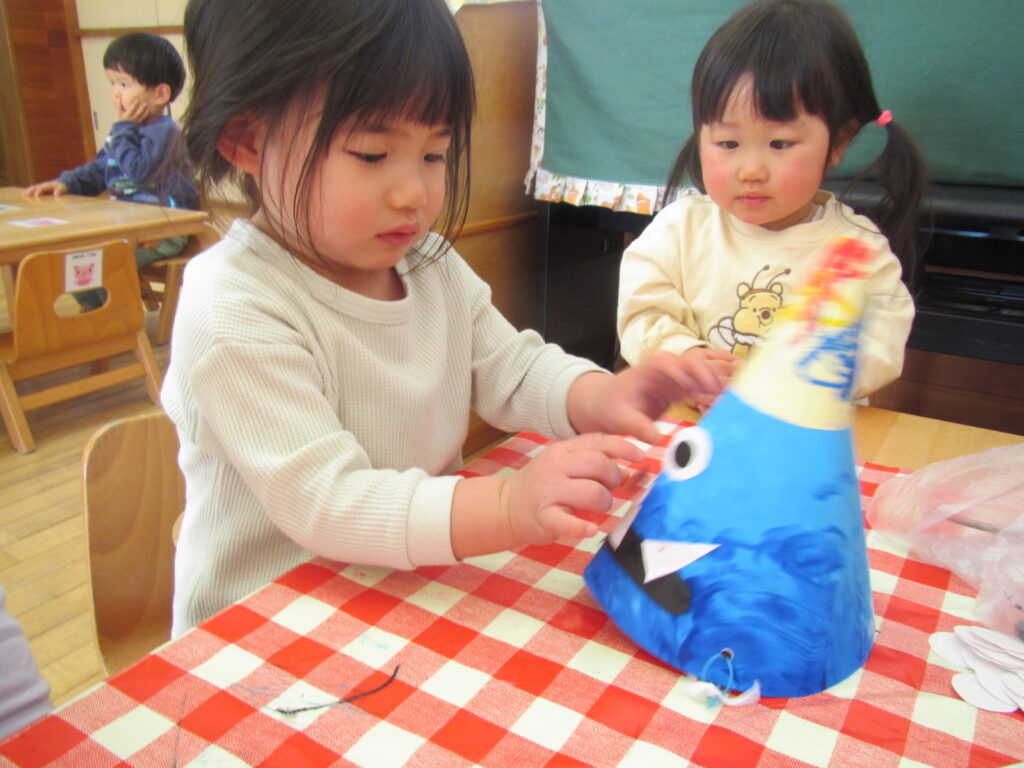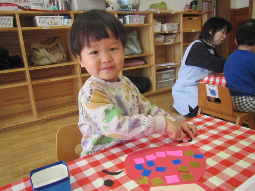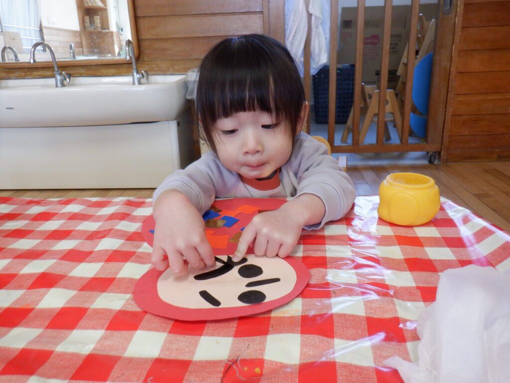 1月の製作の仕上げと、鬼のお面を作りました🎵みんな集中して顔を付けています☺
