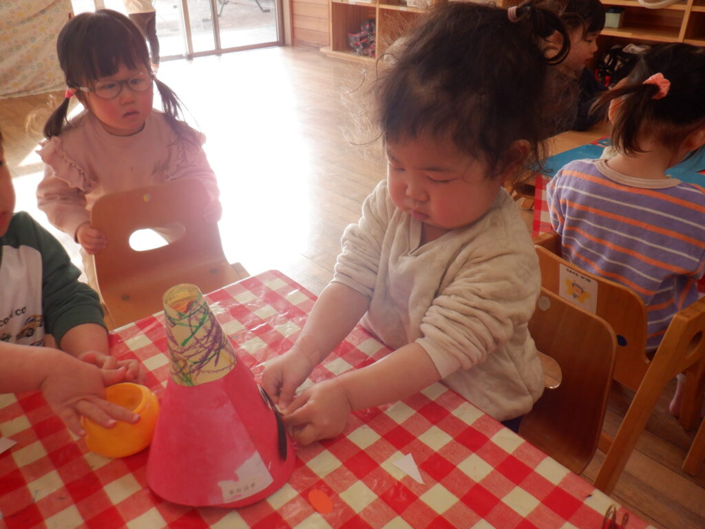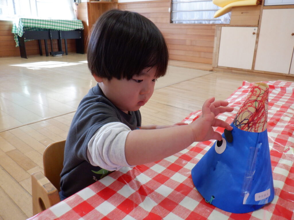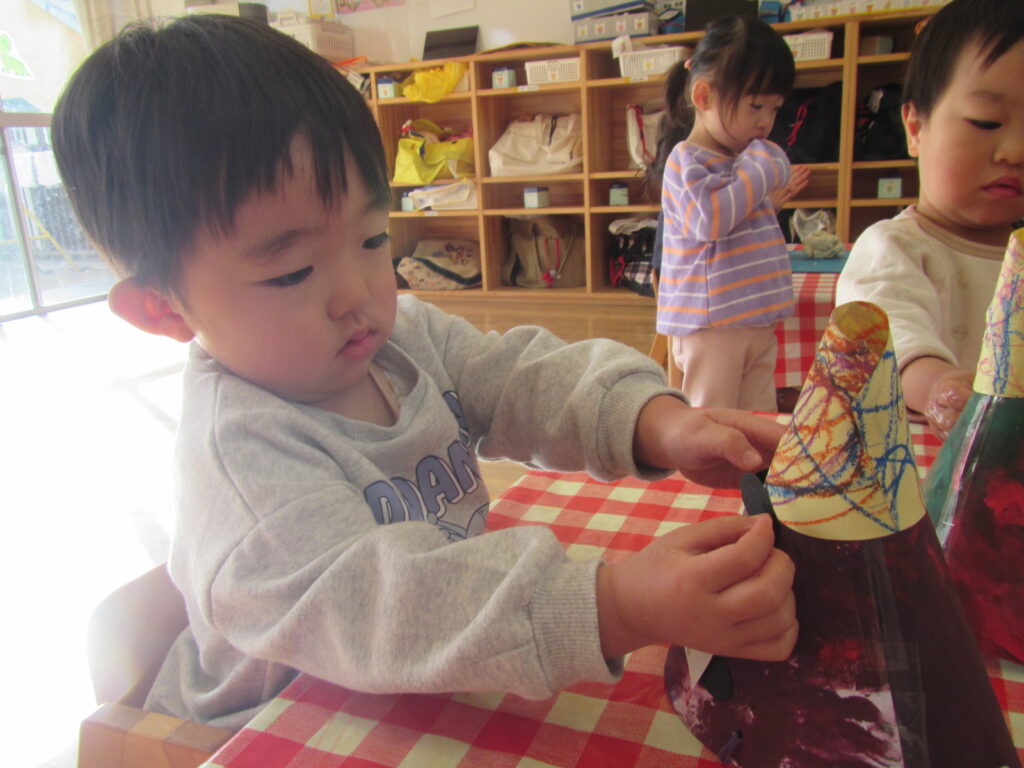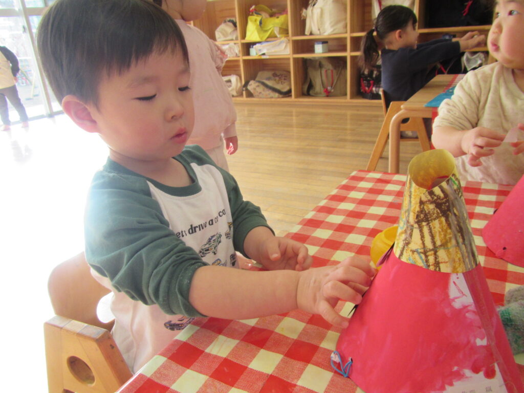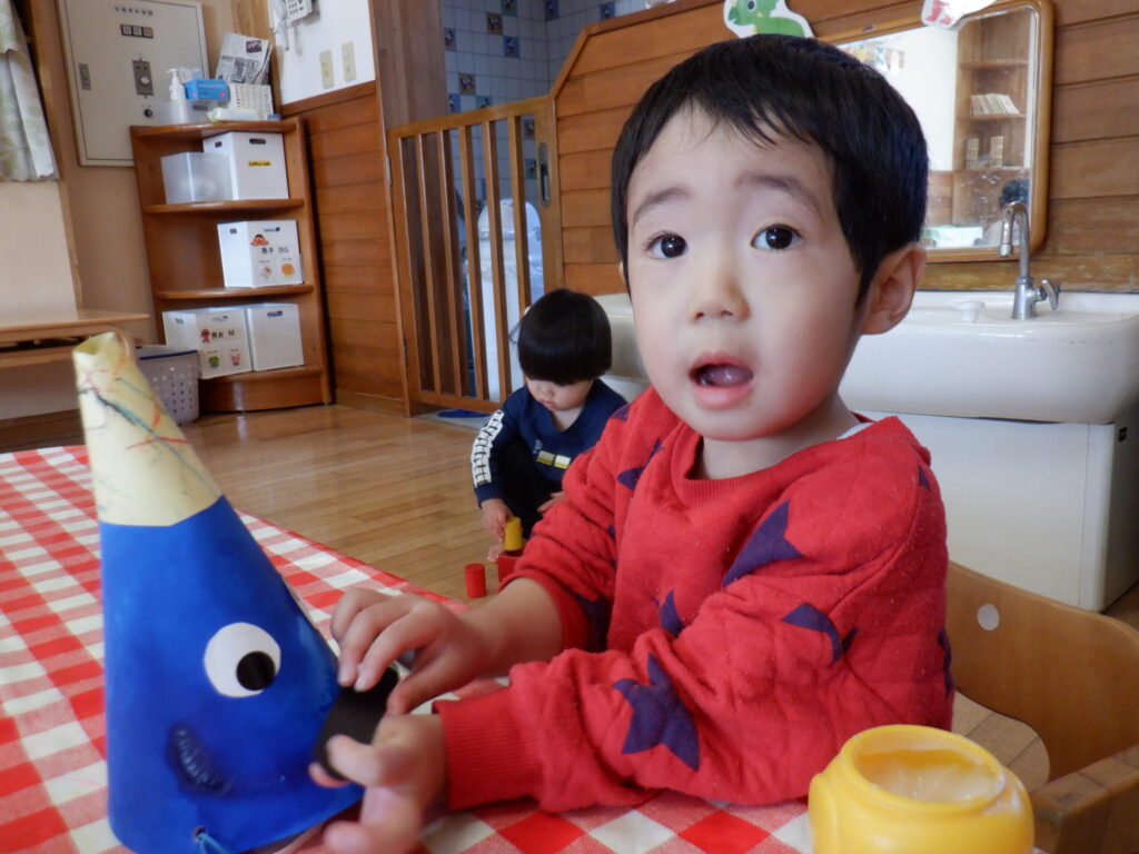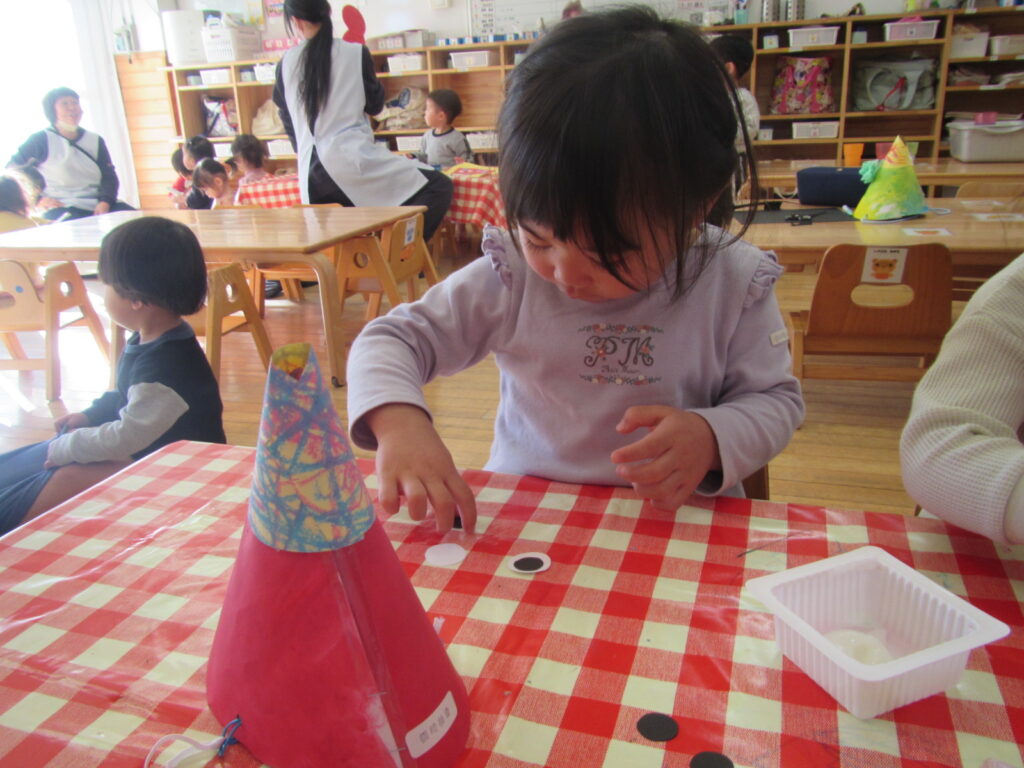 1月の製作の仕上げと、鬼のお面を作りました🎵みんな集中して顔を付けています☺