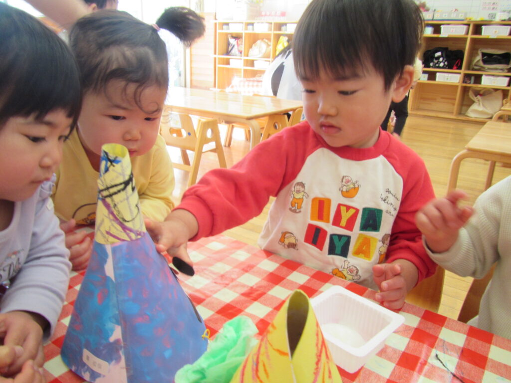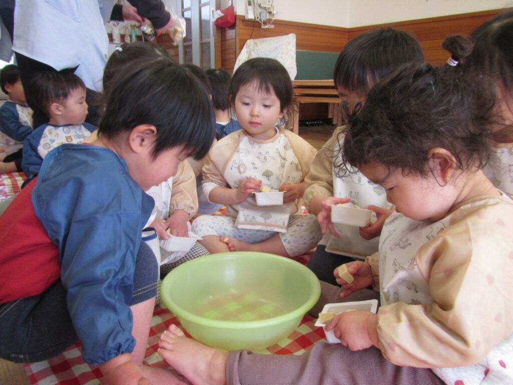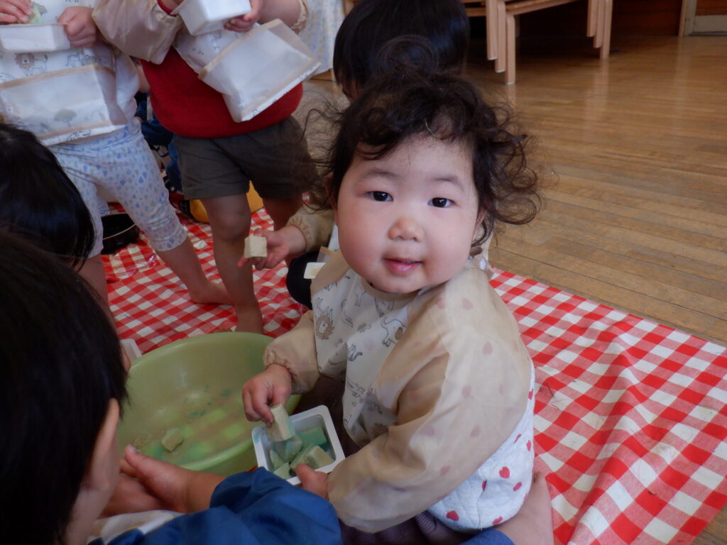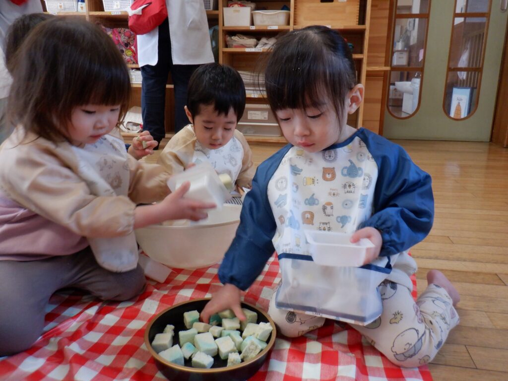 1組さんと一緒に活動しました😊豆腐のパックに高野豆腐を入れて楽しく遊びました✨