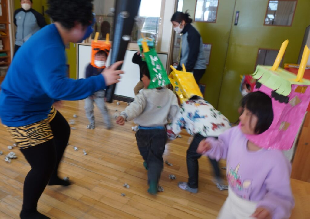 つばめ組さんでは人数が少ない中、鬼に向かって一生懸命新聞豆を投げて鬼退治してくれる様子がありました!