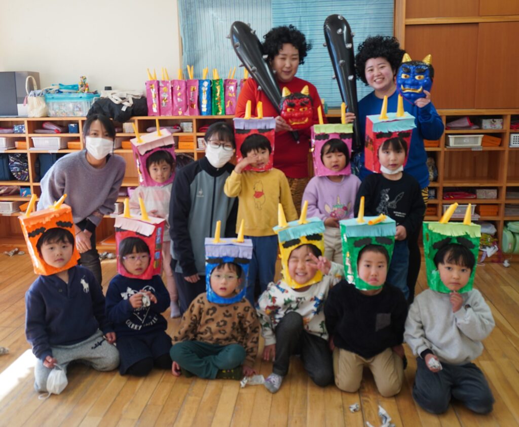すみれ組さんは、鬼を見てもニコニコの子や鬼にお面を付けなおしてもらう子もいました😊