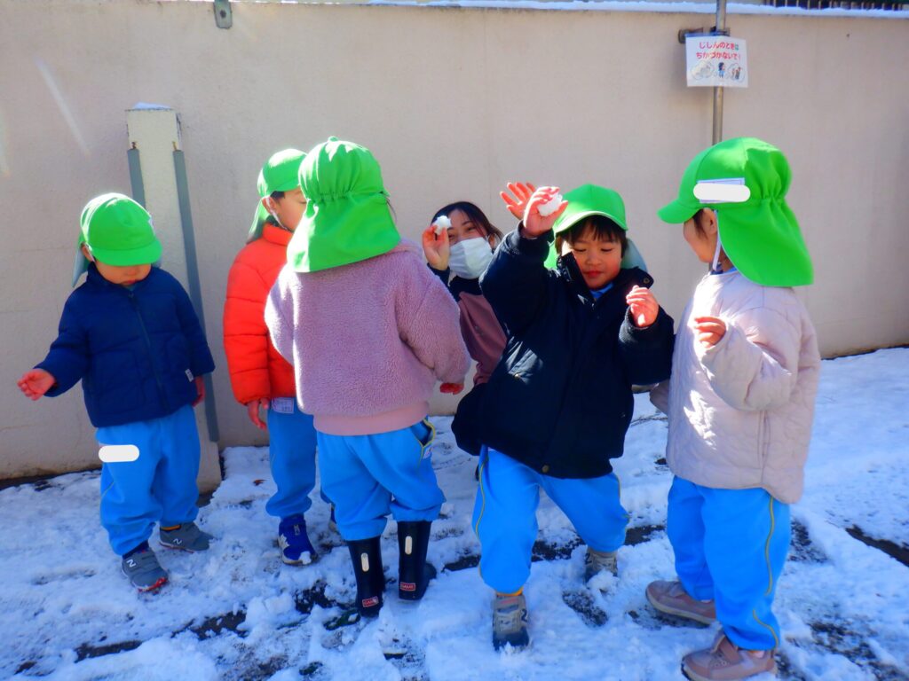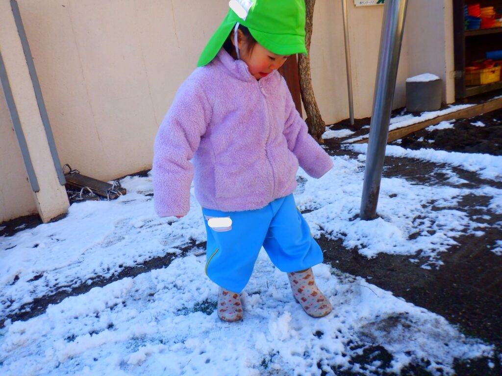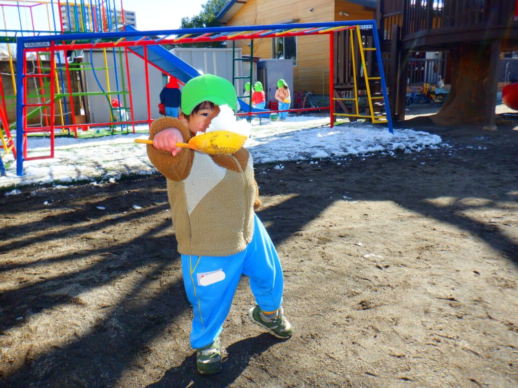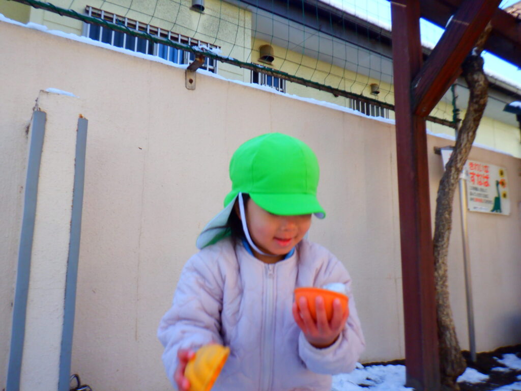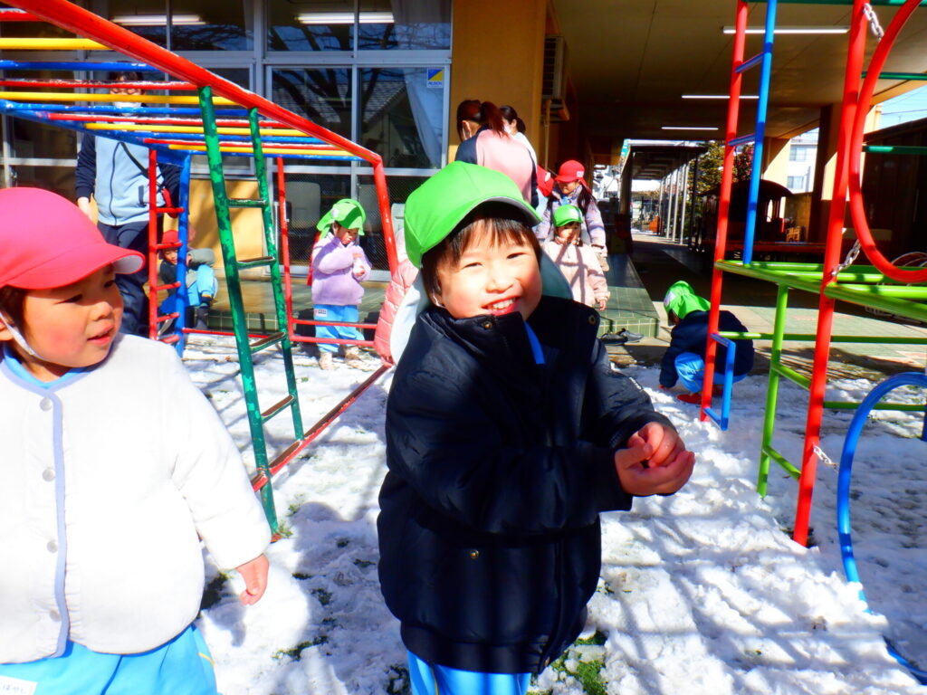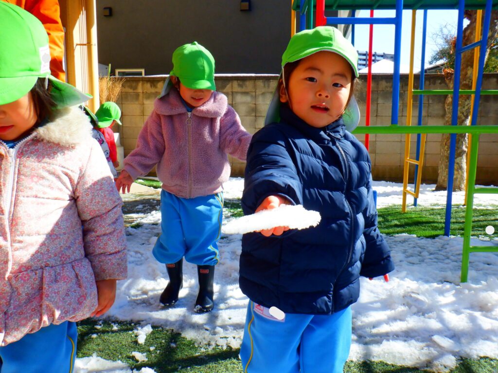 園庭に雪が残っていたので雪遊びをしました!「おうちでも雪で遊んだ!」「雪だるま作ったよ!」など家で遊んだことをたくさん教えてくれました😊