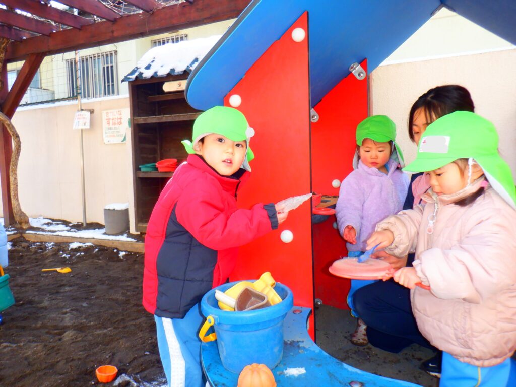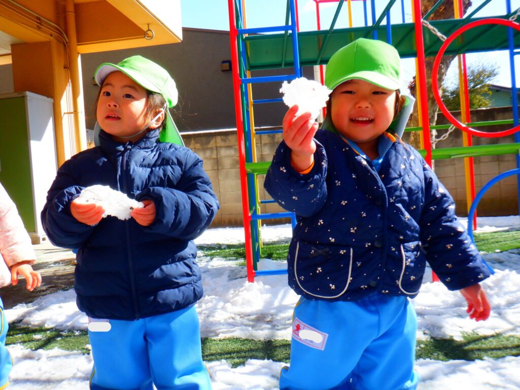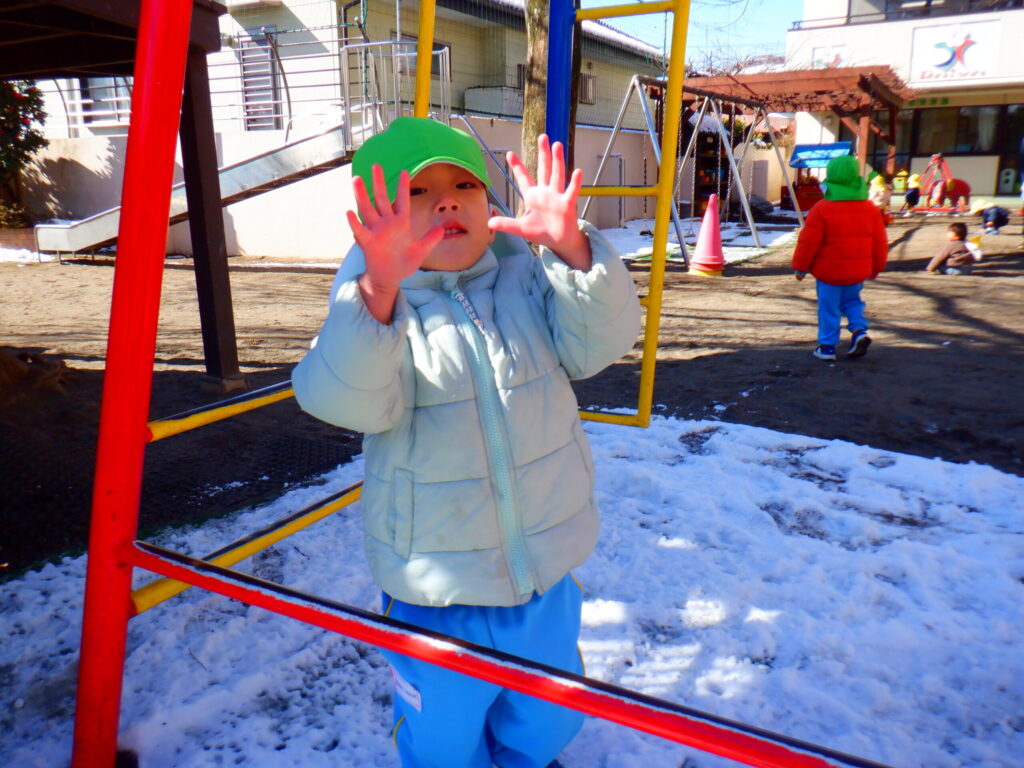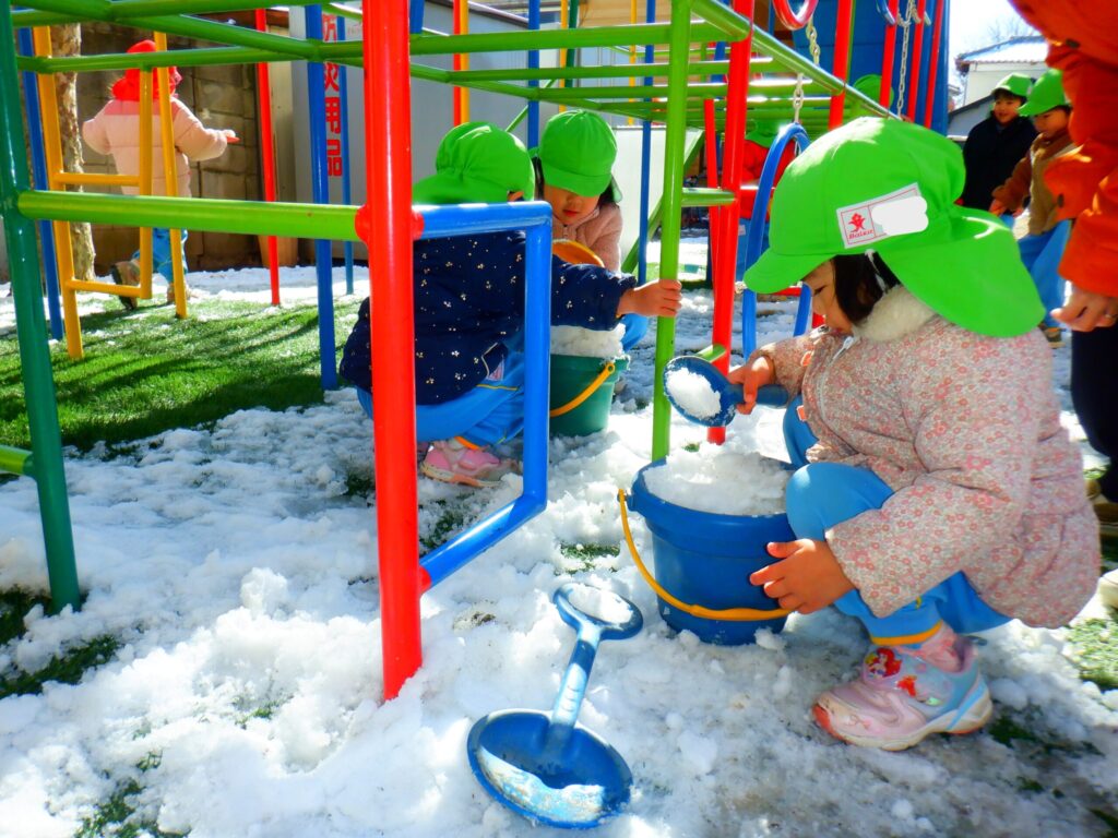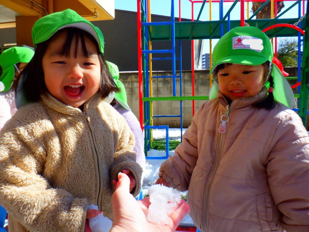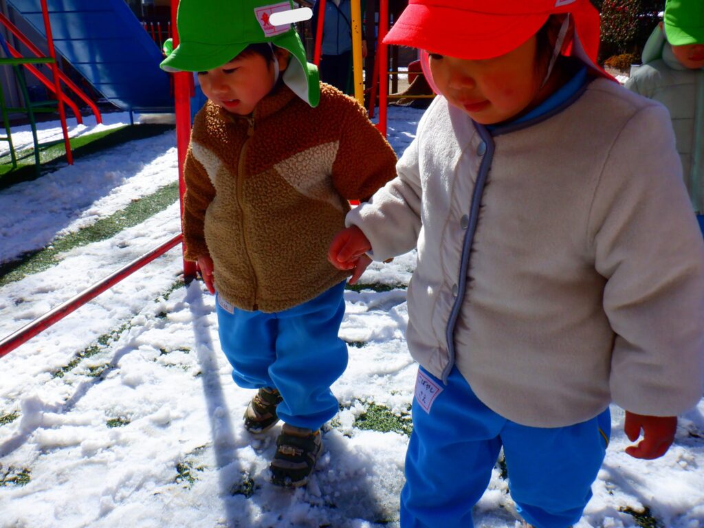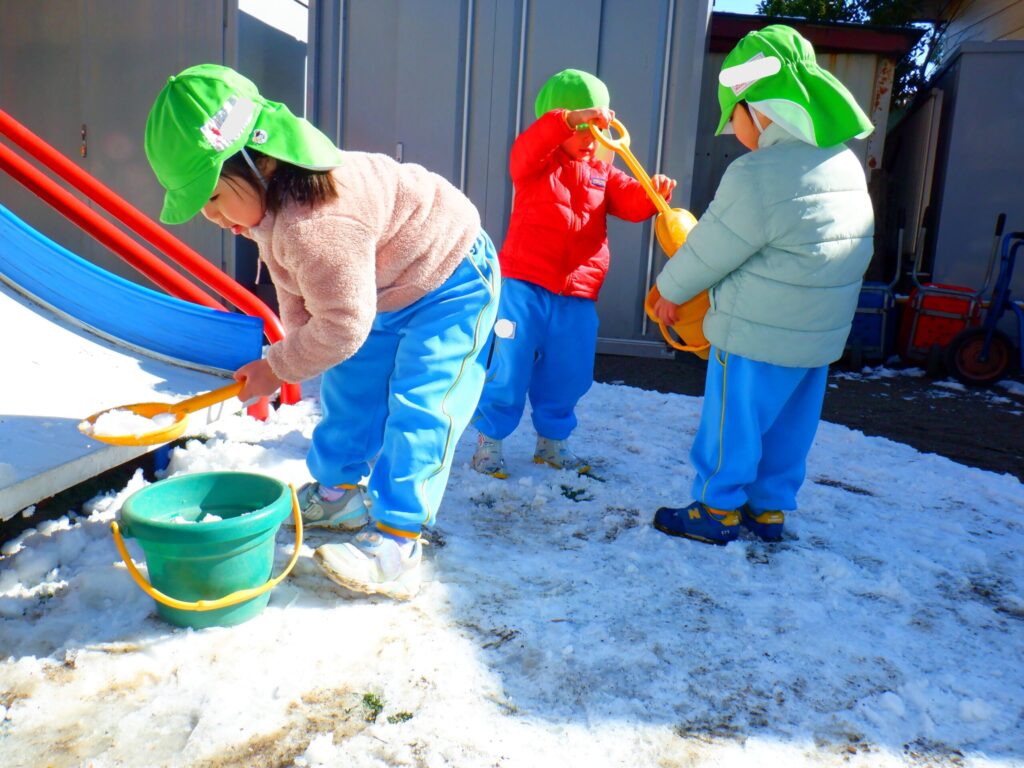 園庭に雪が残っていたので雪遊びをしました!「おうちでも雪で遊んだ!」「雪だるま作ったよ!」など家で遊んだことをたくさん教えてくれました😊