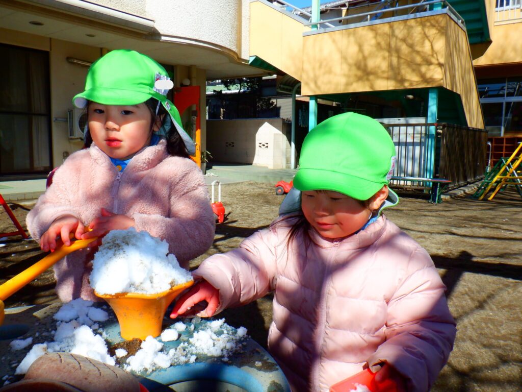園庭に行くと人工芝が一面雪に覆われていて「真っ白だー!」と大喜びな様子でした⛄氷のかたまりを見つけて「冷たい!」と言いながらたくさん触ってみたりバケツやカップを持ってきて「かき氷屋さんでーす!」とお店屋さんを開いてみたり雪や氷で寒い中楽しく遊んだひまわり組さんでした🌻