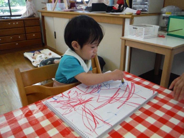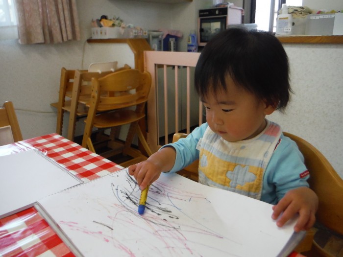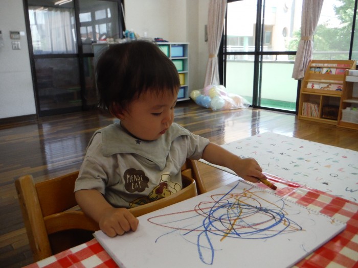 お絵描きグルグル腕を動かして描いている子や横に腕を動かして描いている子、点描を楽しんでいる子といました。自分でクレヨンを選んで描いてそれぞれの個性が出ていました。