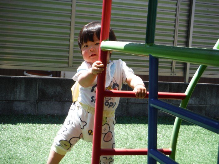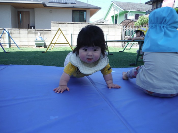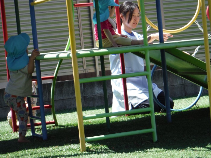 人工芝の遊び場では、マットの上で四つん這いの姿勢で遊んでいる子やジャングラミングの低い梯子や滑り台で遊んでいる子、つかまり立ちをして「いないいないばぁ」を先生に向かってしている子それぞれ一人遊びを楽しんでいました。