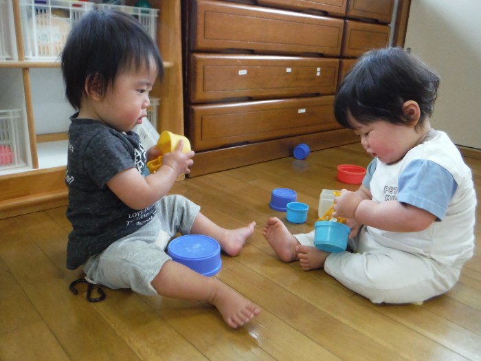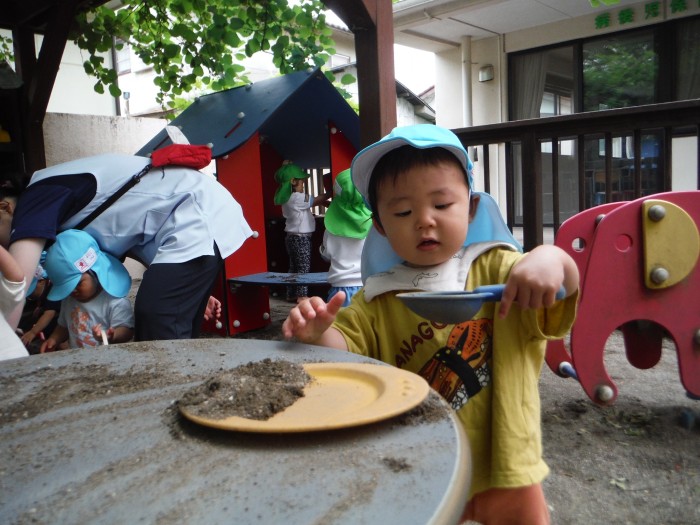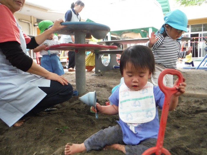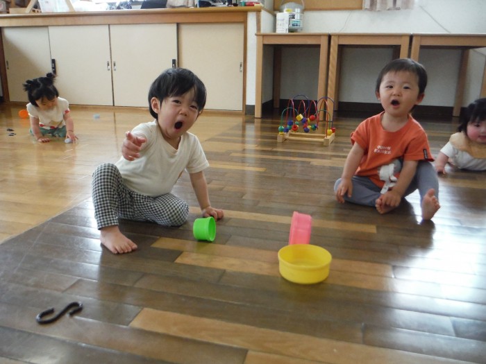 園庭では砂場でシャベルを持って遊んだり、お部屋ではポットん落としやカップを転がしたりして友達とかかわって遊ぶ姿が見られました。