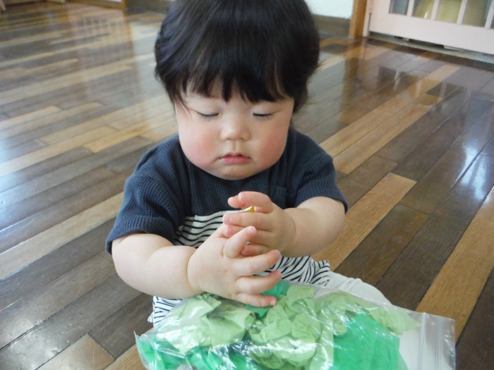お花紙をビリビリ破いたり、丸めて袋に詰め、「これ何になるの?」と不思議そうに袋を眺めて