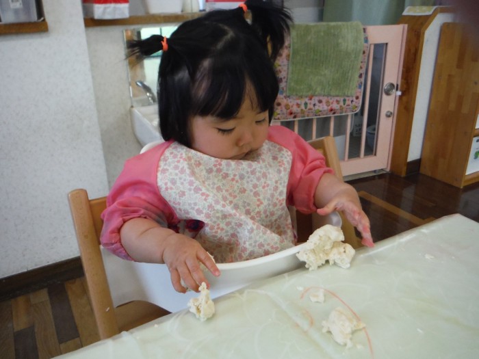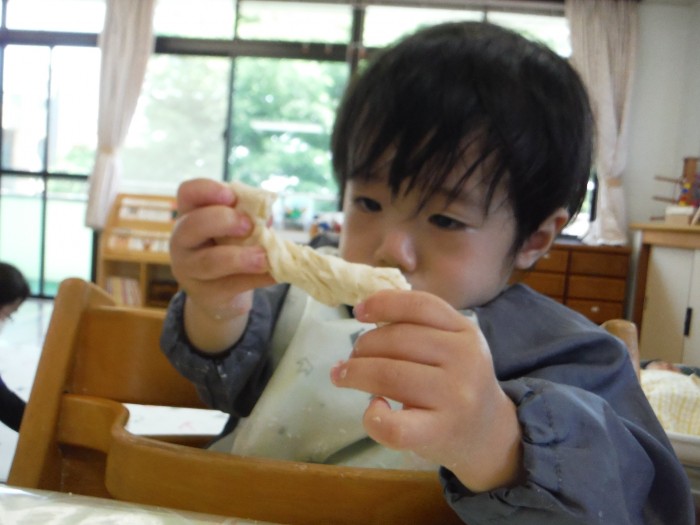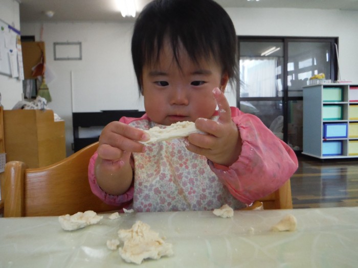 小麦粉粘土ではビヨ~ンと伸ばしたり、上手に指先を使って千切ったり、グニュグニュと握りったりと、小麦粉粘土の感触を楽しんでいました!