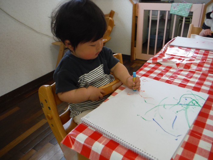 自由画では前回よりも力強く、たくさん描けるようになってきました!!「うぅ~わっ!」「グルグル~」とお話しながら描いている子も居ました♪