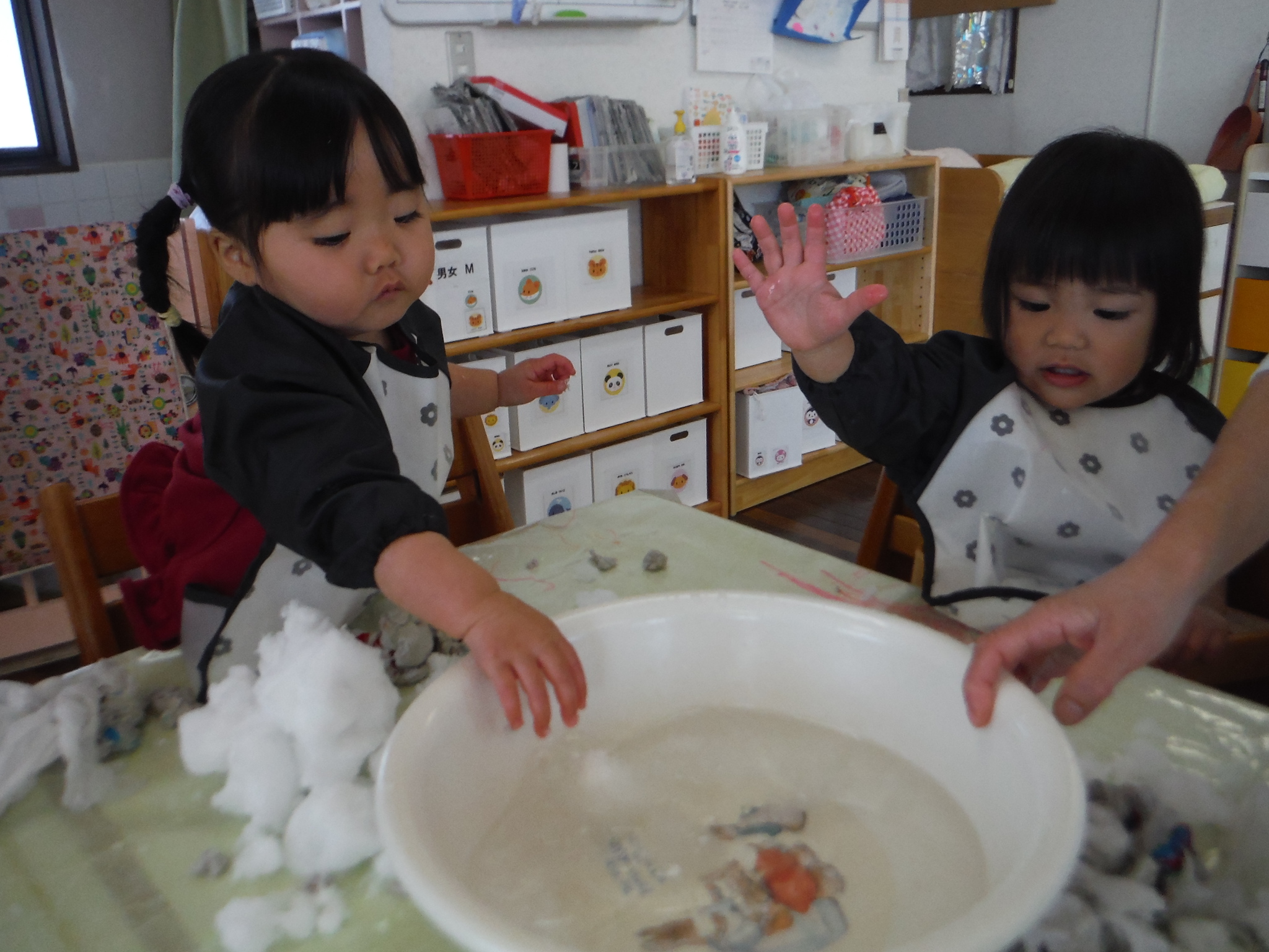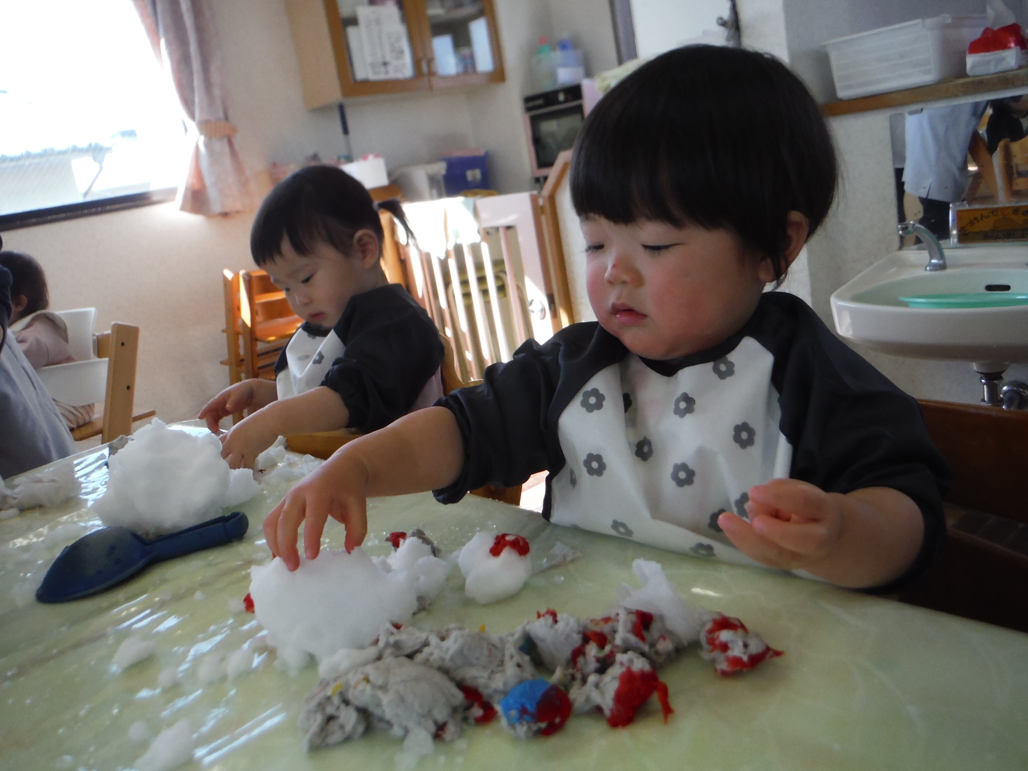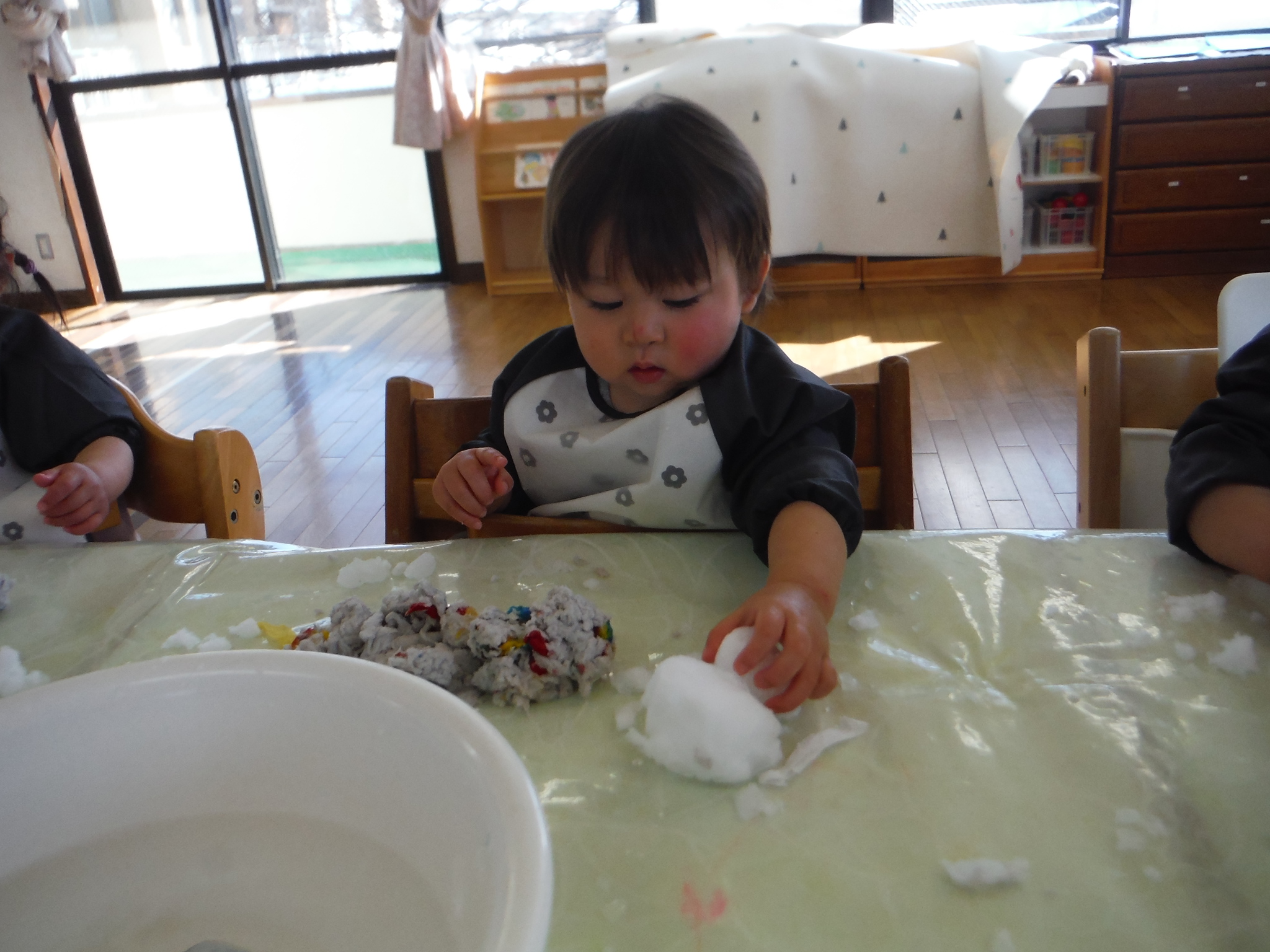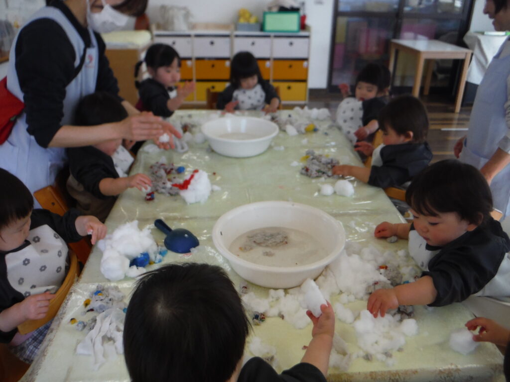 ぬるま湯で遊ぶと気持ちいいね!日曜日に降った雪で雪遊びも。雪だるまを作ったり、お水に入れてなくなっちゃうのを楽しみました!