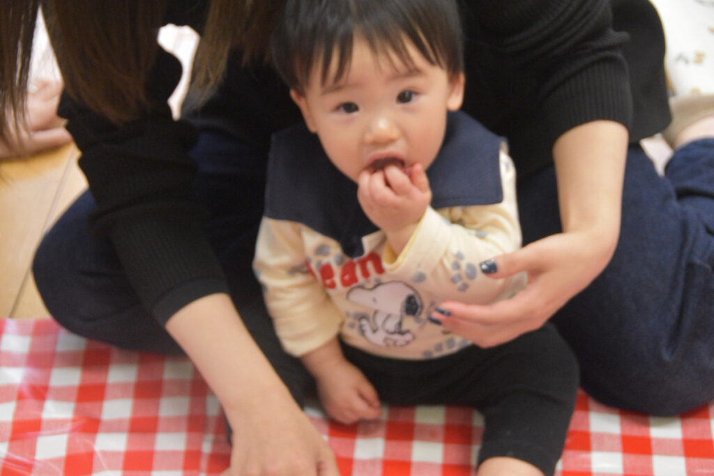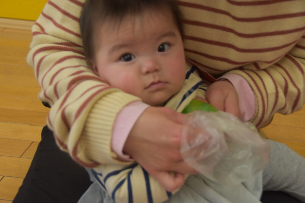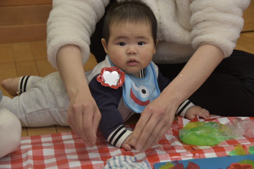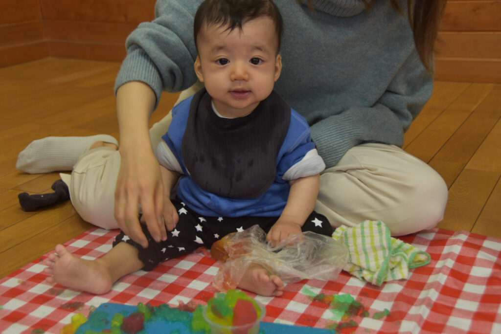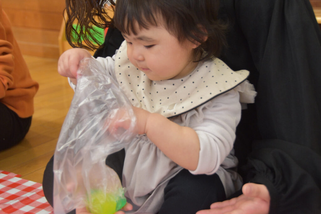 小さなお友だちは、袋の中に入れた寒天をギュッギュッ!にぎにぎできたよ~😊