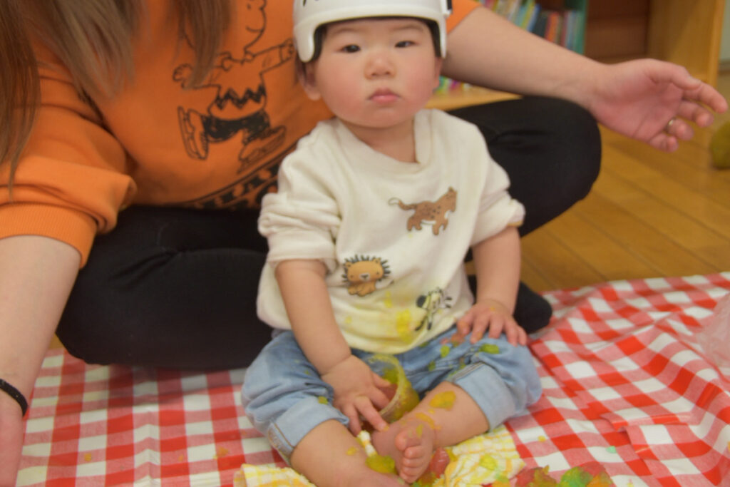 大きな寒天をツンツン指で触ってみたり、キューブ型の寒天を一生懸命つかもうとしてみたり…手や指をたくさん使って遊んでくれました♡