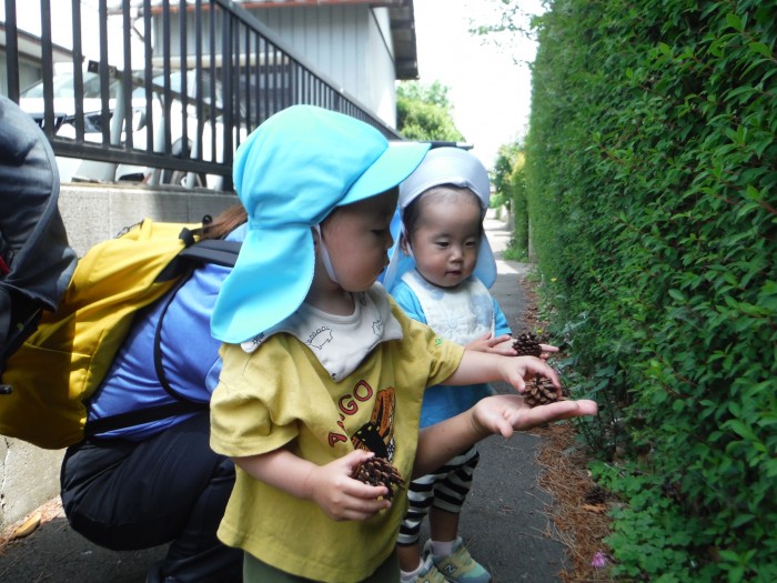 きれいに咲いた花や虫を見つけたり、松ぼっくりを拾いお話をたくさんしながらお散歩を楽しみました。