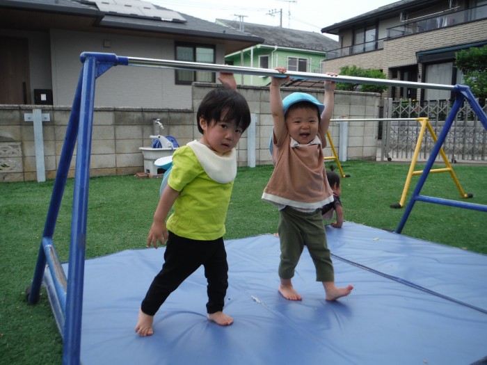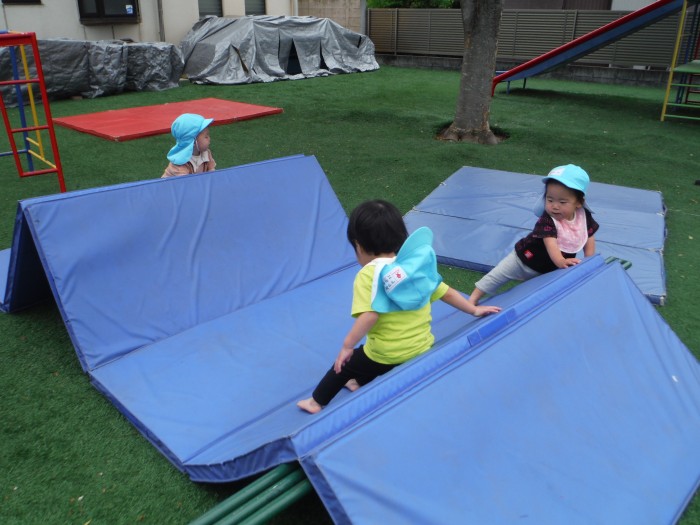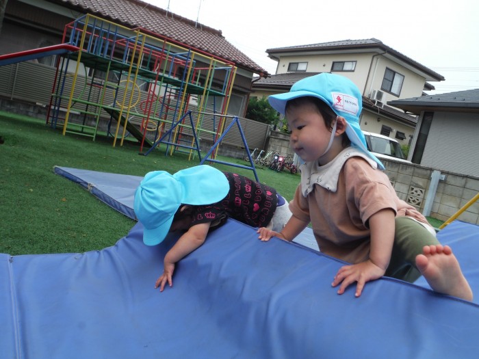 マットでお山を作ると、「わぁ~!!」駆け寄り一生懸命上り下りしていたたんぽぽ2組さん。上手にバランスをとれるようになってきました。たんぽぽさんの姿を見て「僕も!」とひよこ組さんも登れるようになりました!鉄棒も上手にぶら下がれるかな?