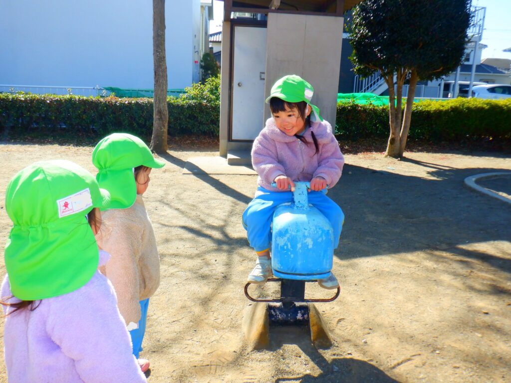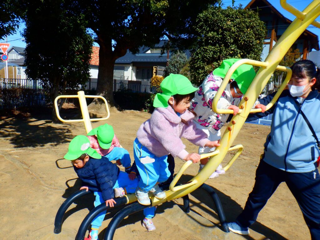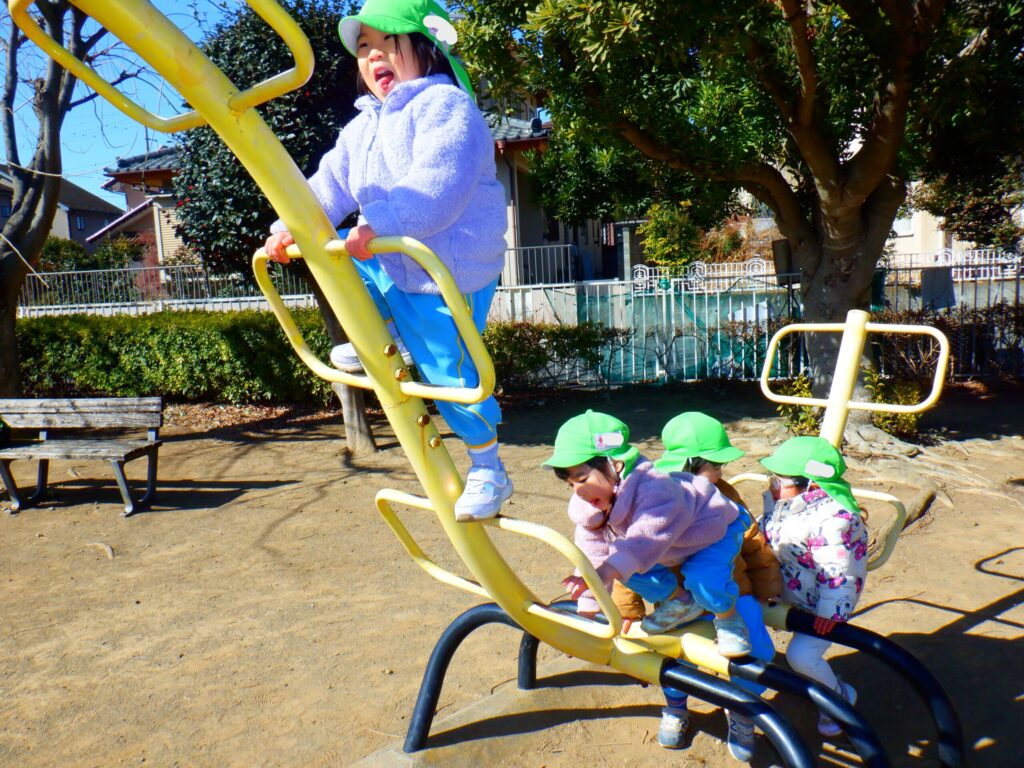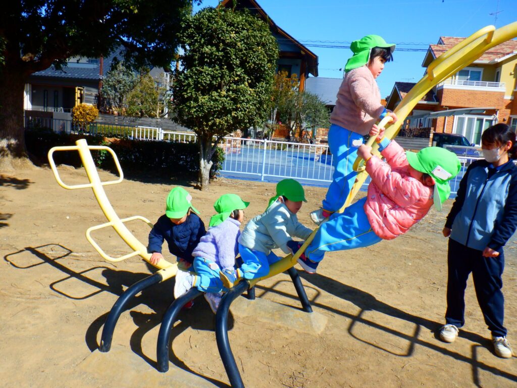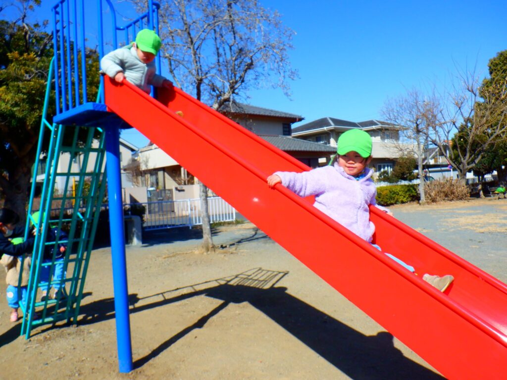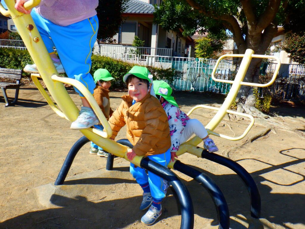 公園に着くといつもより高い滑り台や虫さん遊具など楽しみ、たくさんの笑顔が見られました。