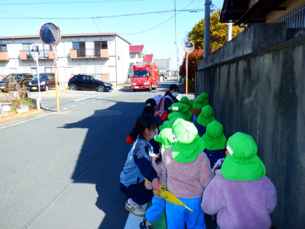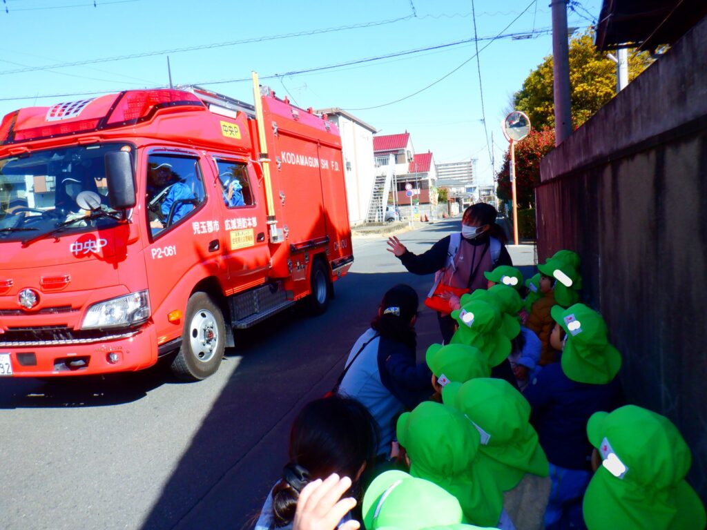 帰り道にはなんと、消防車が!!みんなテンションが上がっていました!