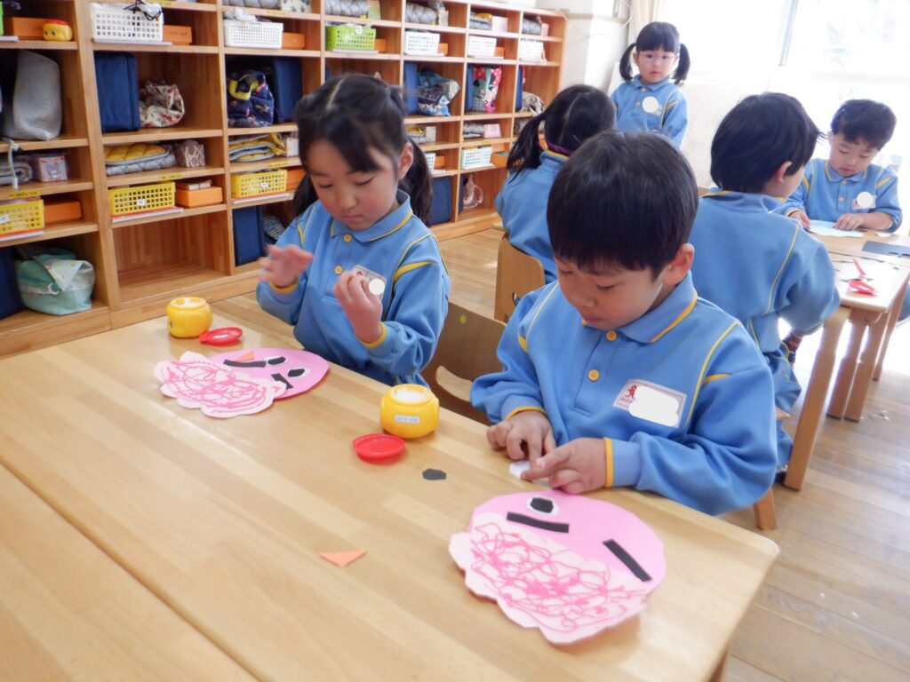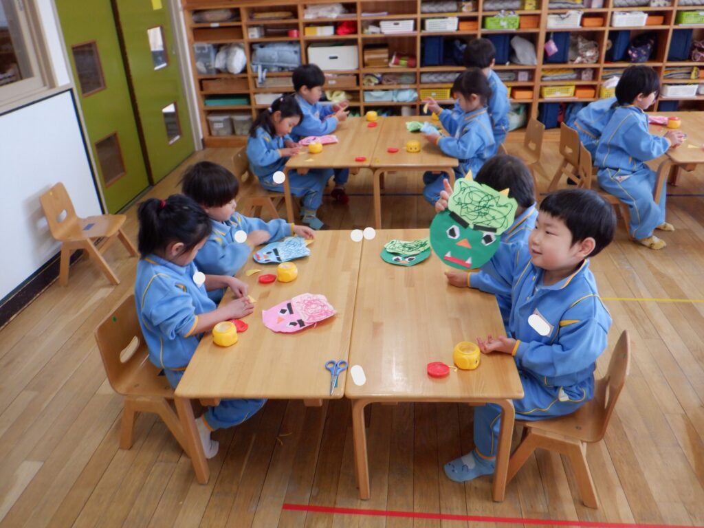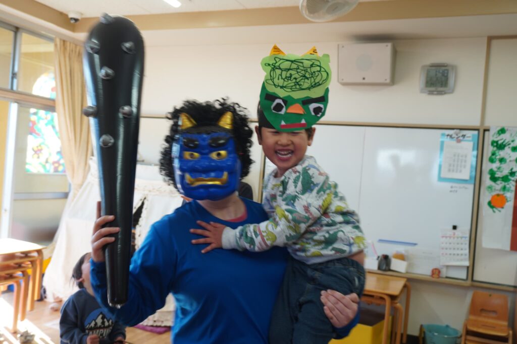 2月3日に鬼退治をしました。大きい声で「鬼は外!福は内!」を豆を投げられる子が沢山いました。怖くて泣いてしまう子もいましたが、退治できました!