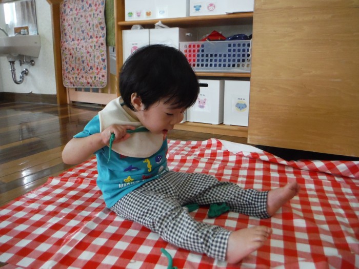小麦粉粘土とは違い、ちょっぴり硬い粘土ですが、上手に指先を使って伸ばしたり、千切ったりして楽しんでいました。