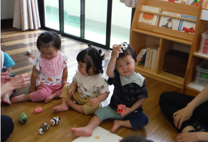 子どもたちの手に収まるほどの小さめなお手玉や、手作りのお手玉で遊びました。ポ~ンと投げたり、頭にのでて落とすことを楽しんでいました。