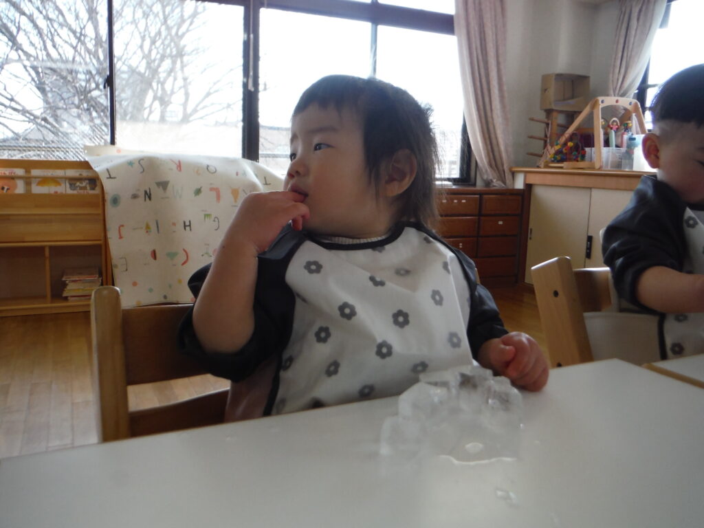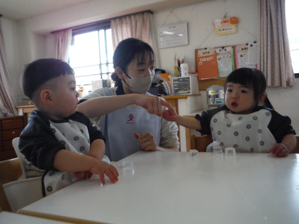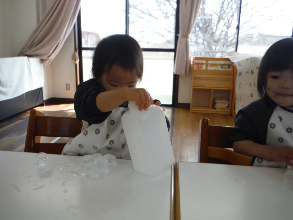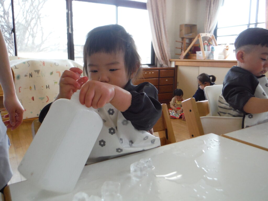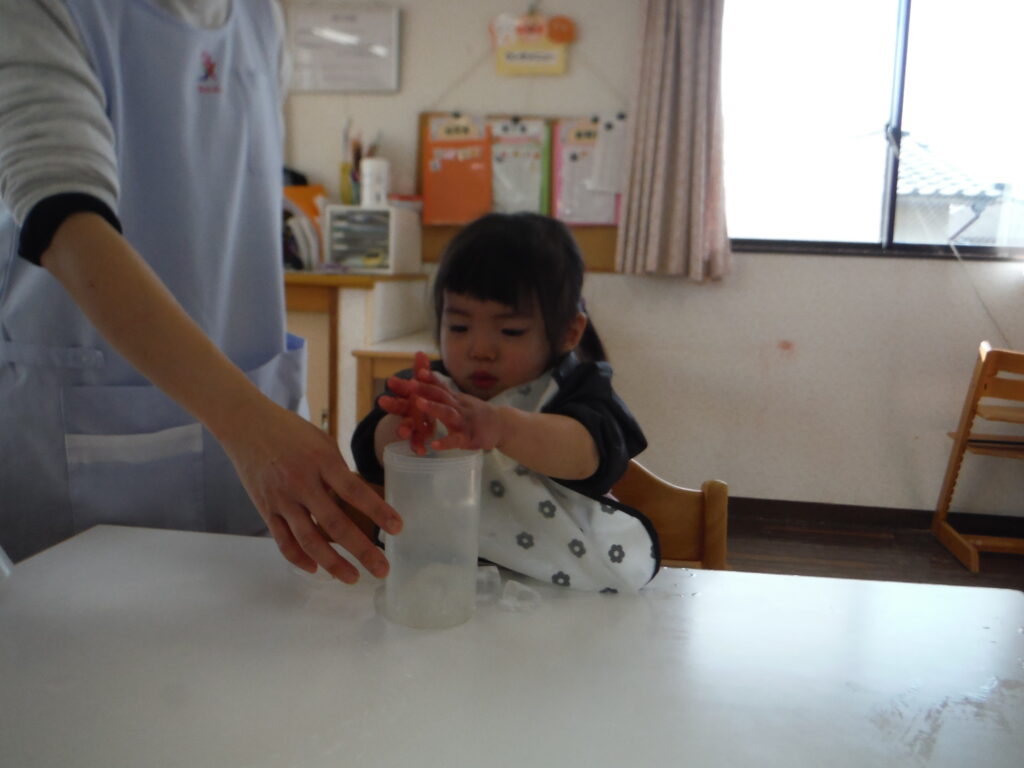 〇氷をポットン!感触遊びをしました。
