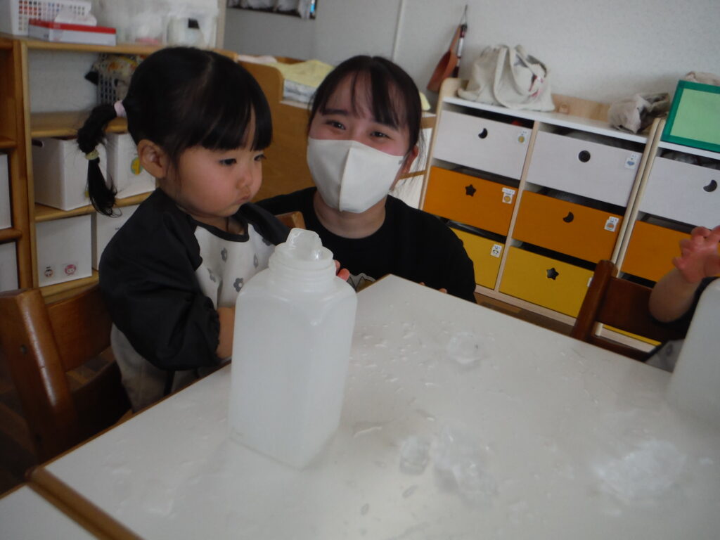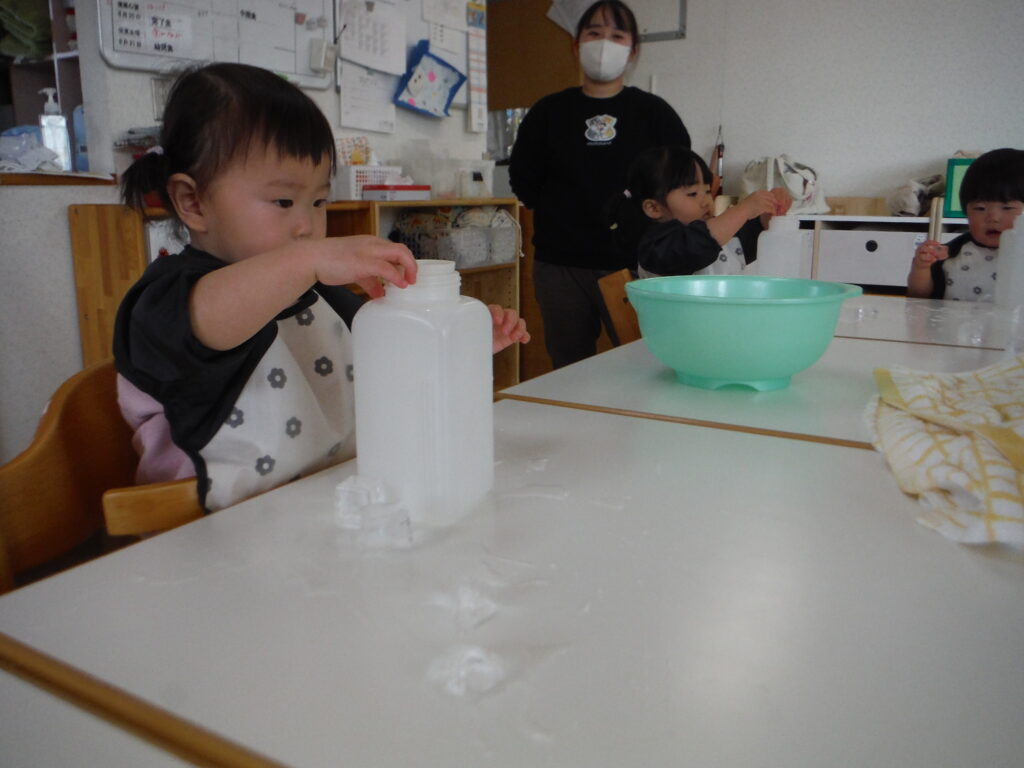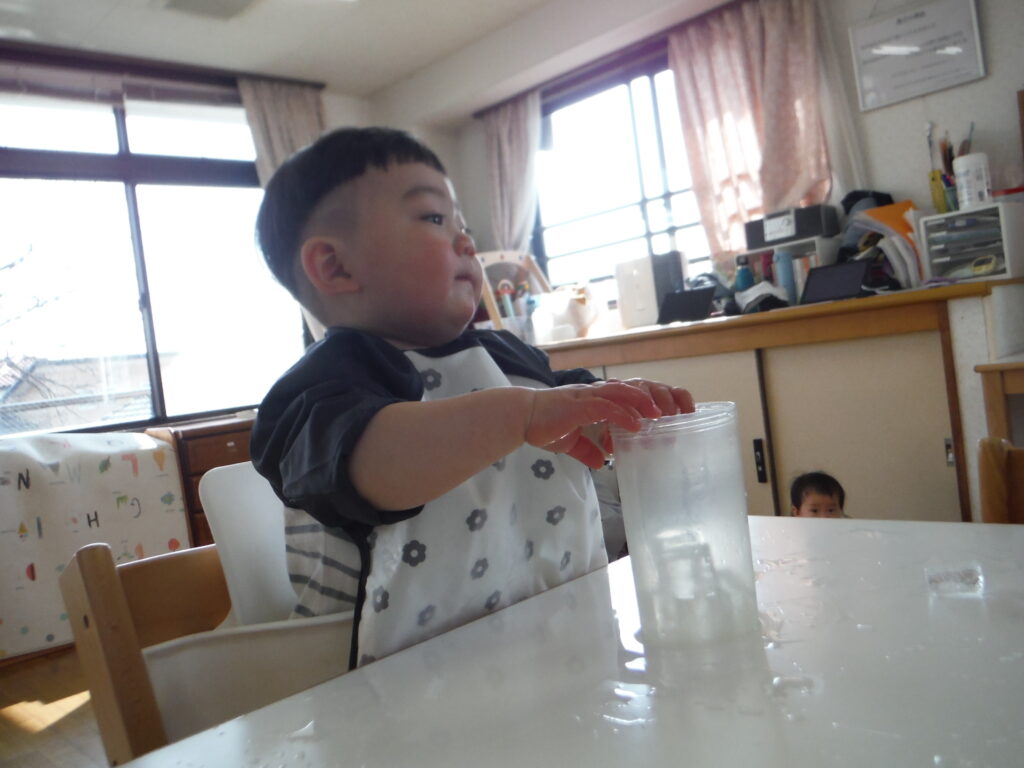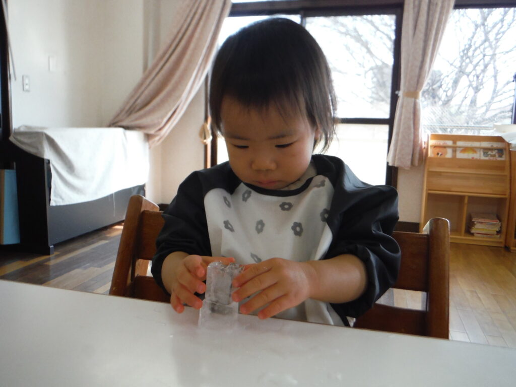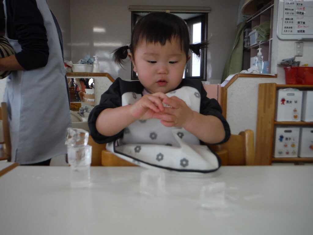 〇氷をポットン!感触遊びをしました。
