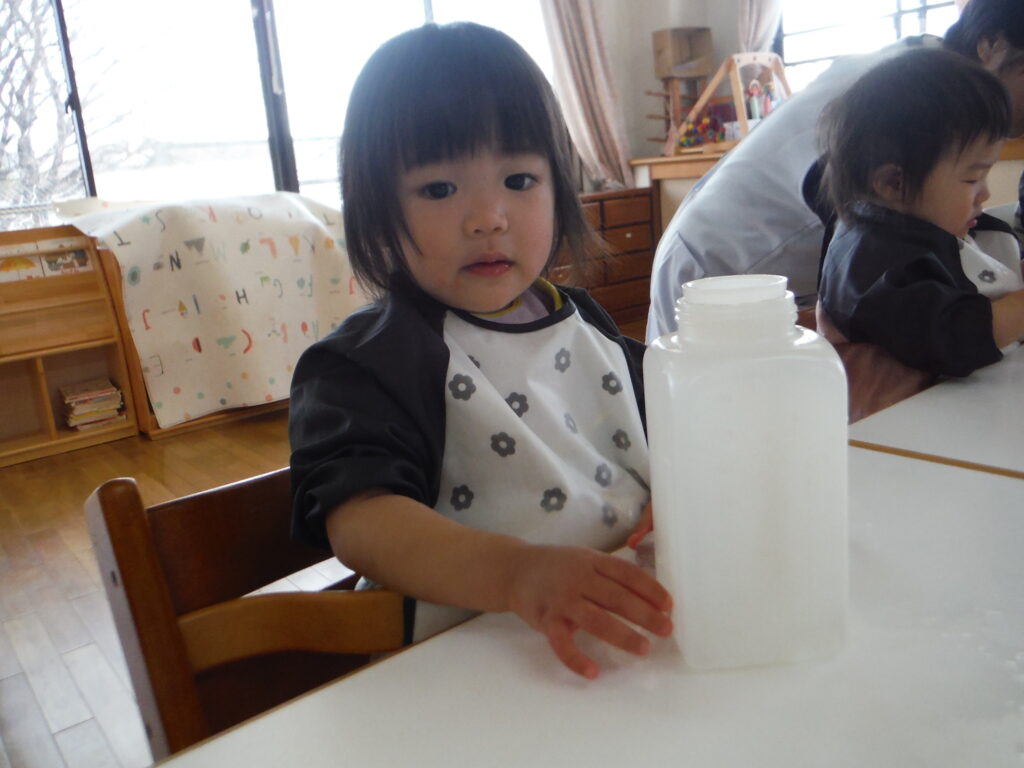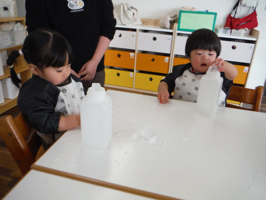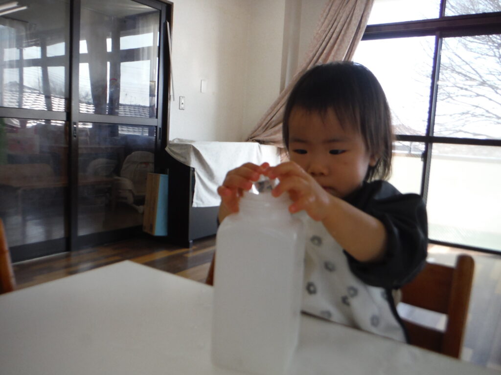 積み木みたいに重ねたり、ボトルにポットンと入れたり、出したり。気が付いたら、小さくなっていて、不思議だったね。