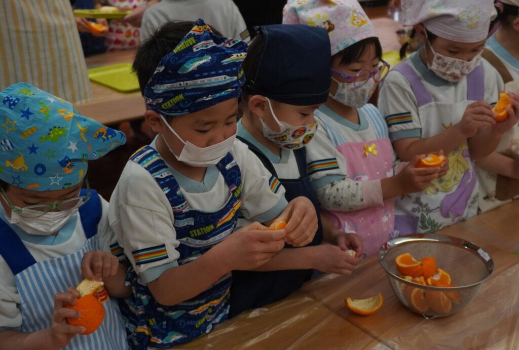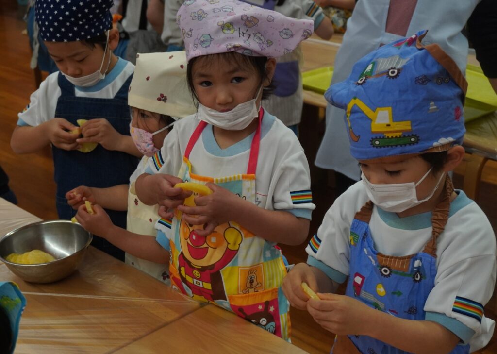 すみれ組はパイナップルを手でちぎり小さくし、つばめ組はみかんの皮を剥いて、とんぼ組はバナナをフォークで切ってくれました🍌