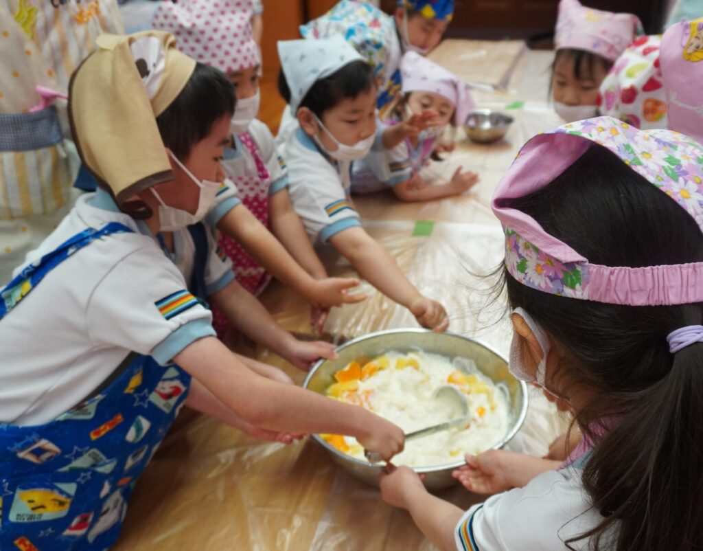 果物をヨーグルトの中に入れて、「美味しくなーれ♪」とみんなで言いながら混ぜてくれました✨