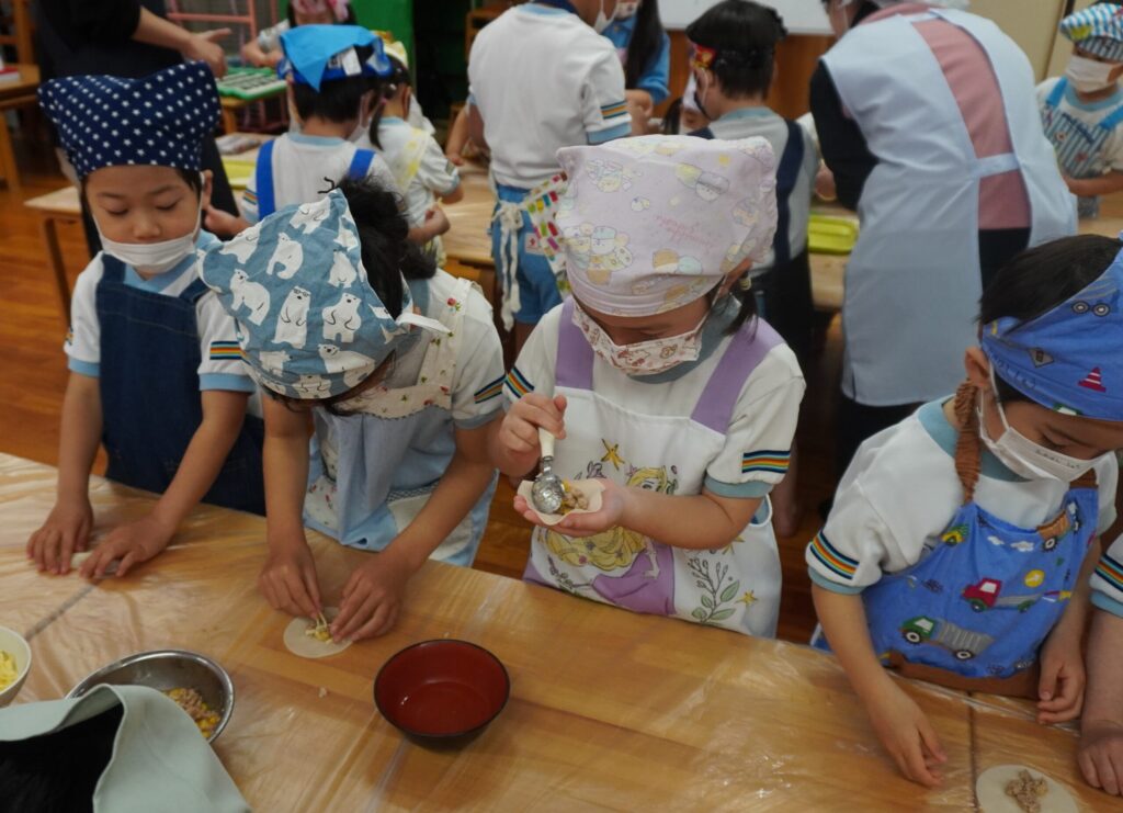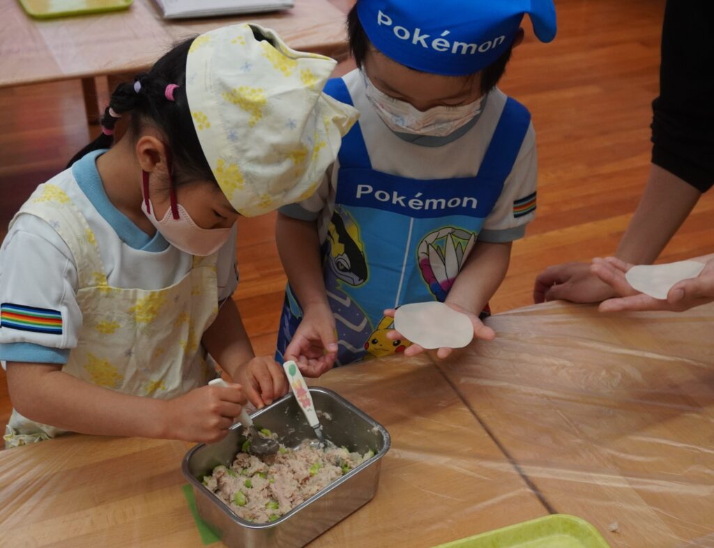 次は餃子の皮に給食の先生が作ってくれた種を入れて、包みました🥟