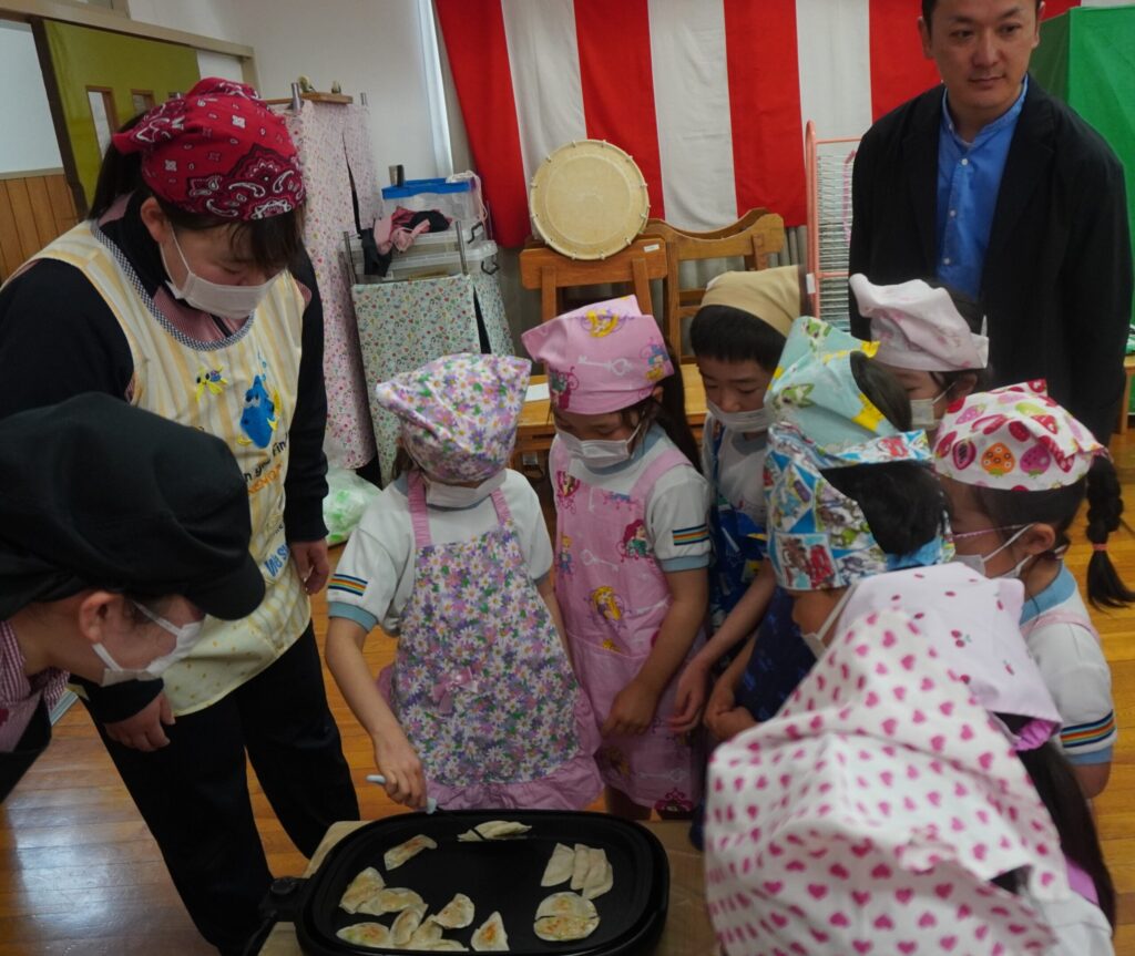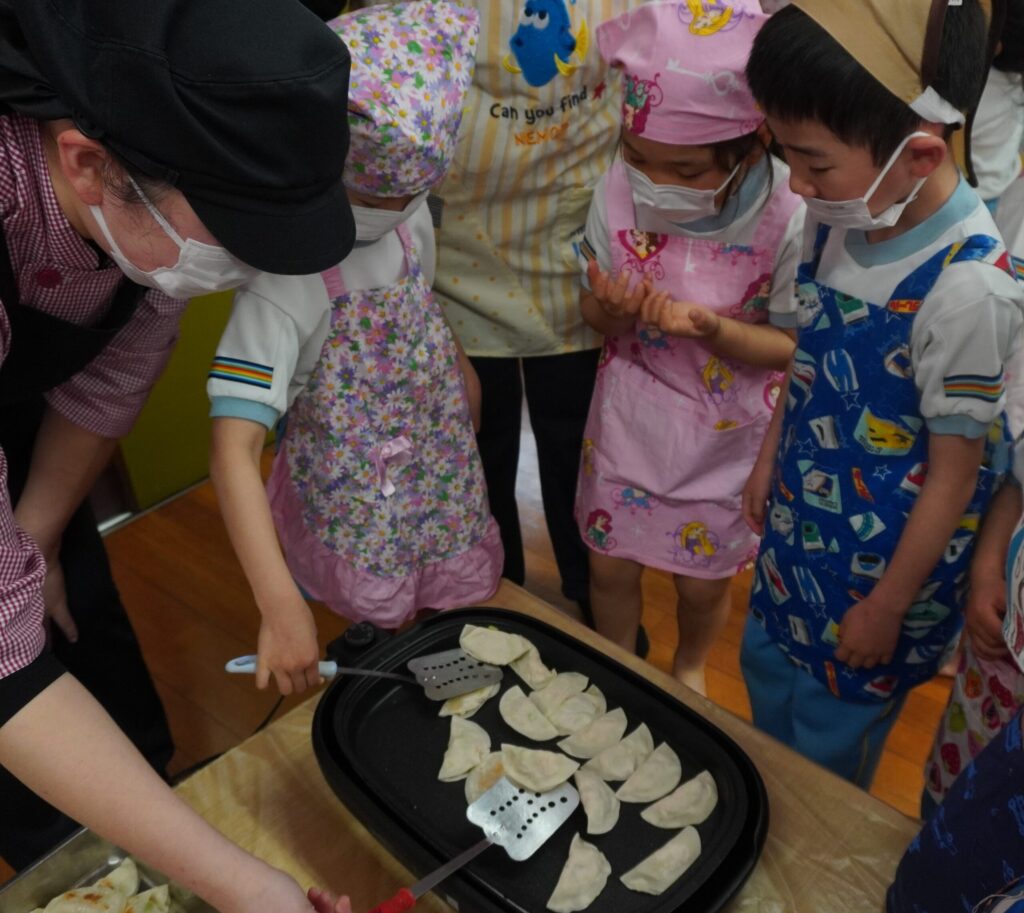 みんなで作った餃子をホットプレートで焼いてお給食の時間で食べました😋