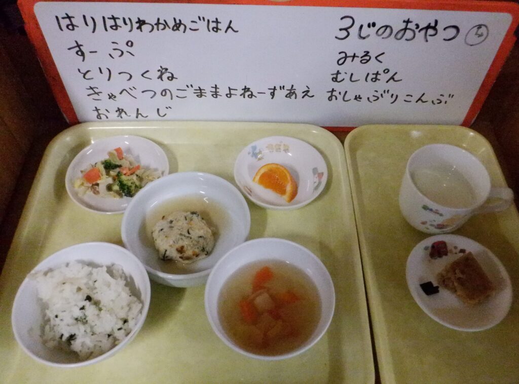 ・はりはりわかめごはん ・スープ ・鶏つくね ・きゃべつの胡麻マヨ和え ・みかん