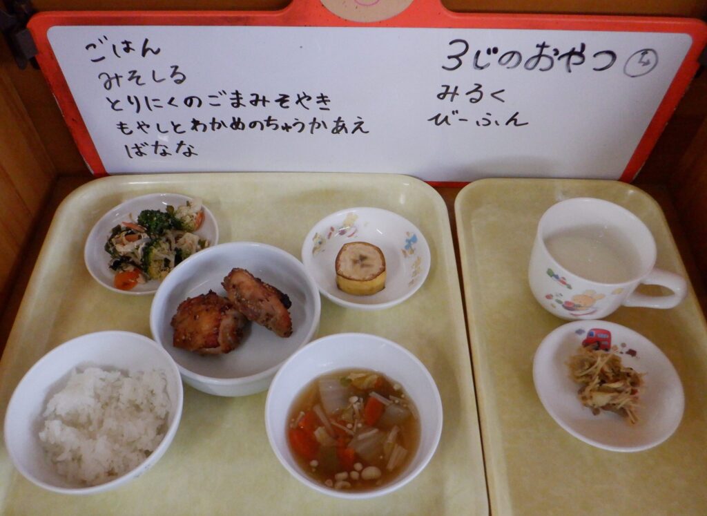・ごはん ・みそしる ・鶏肉の胡麻味噌焼き ・もやしとわかめの酢の物 ・みかん