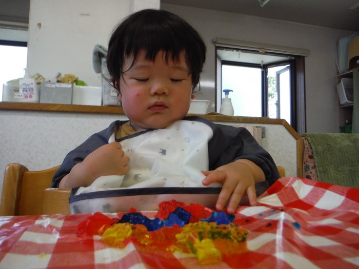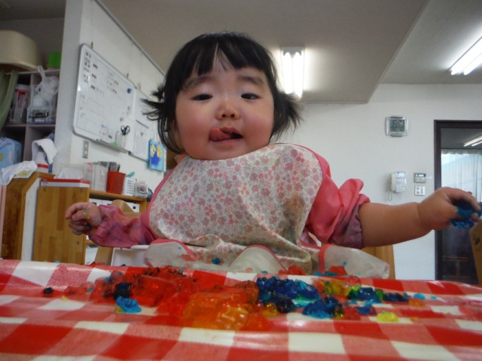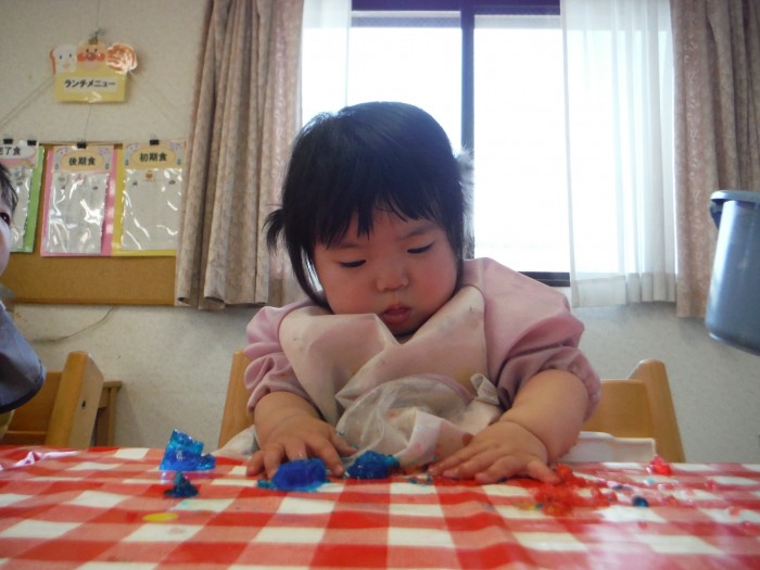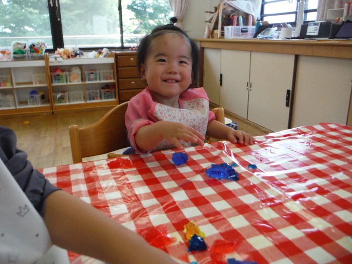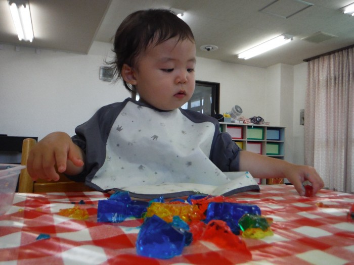 感触遊びでは、ゼラチンゼリーで遊びました。にぎにぎ♪冷たくて気持ちいね!