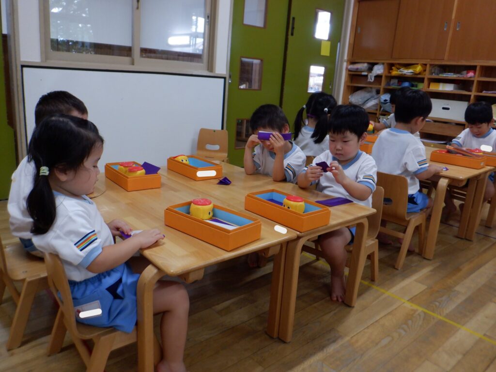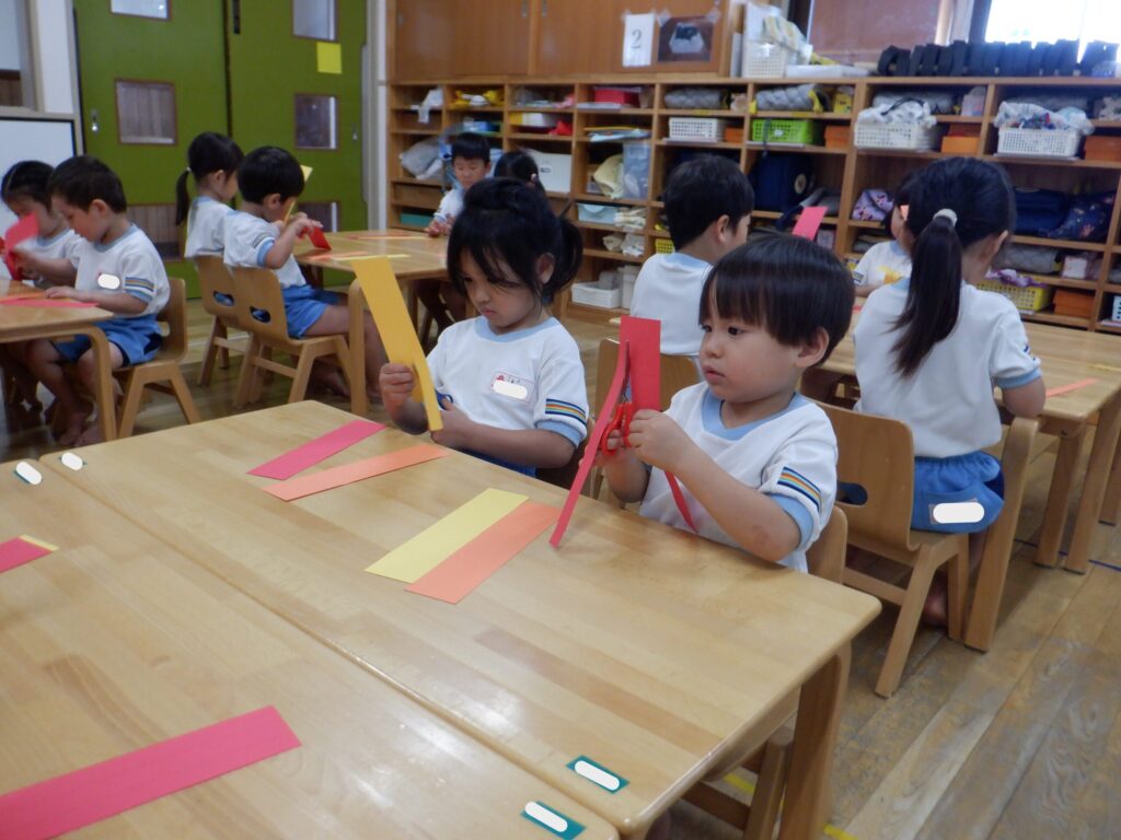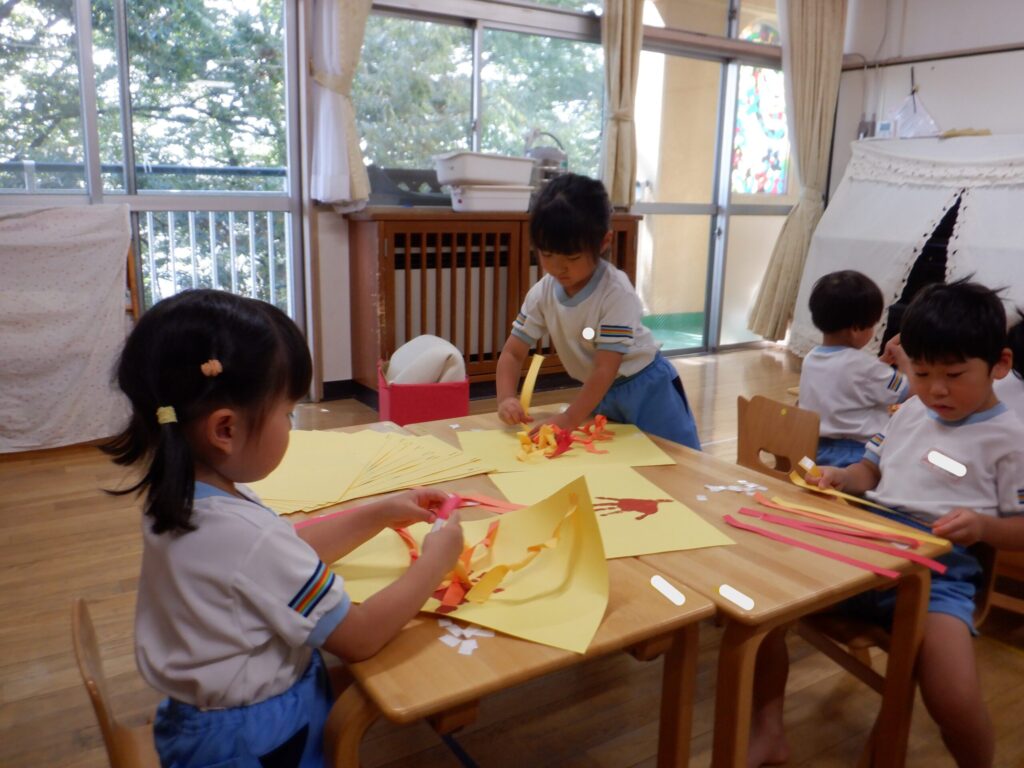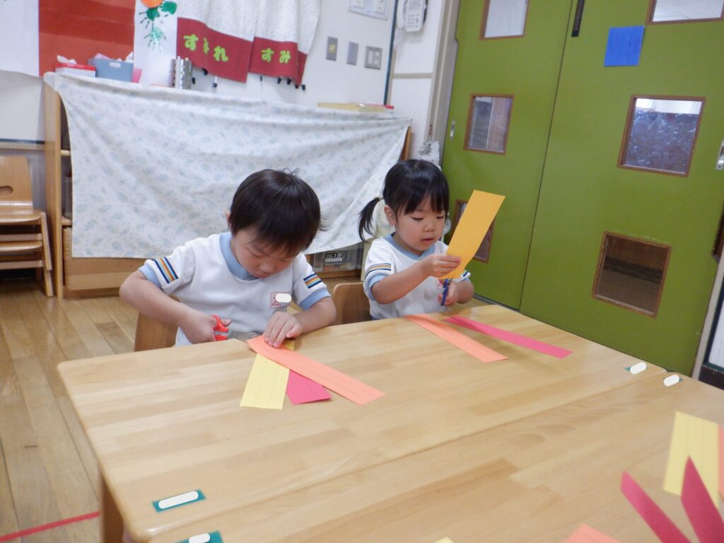 鋏で画用紙を切り、くるくるして紅葉に見立てました。くるくるするのが難しいお友達もいましたが、「可愛くできた!」「上手にやったよ!」と楽しんでいました。