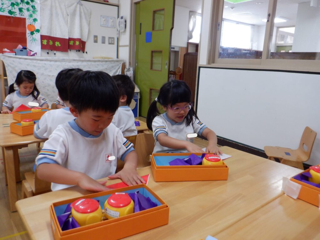 先生のお手本をよく見て、上手に折っていました。
