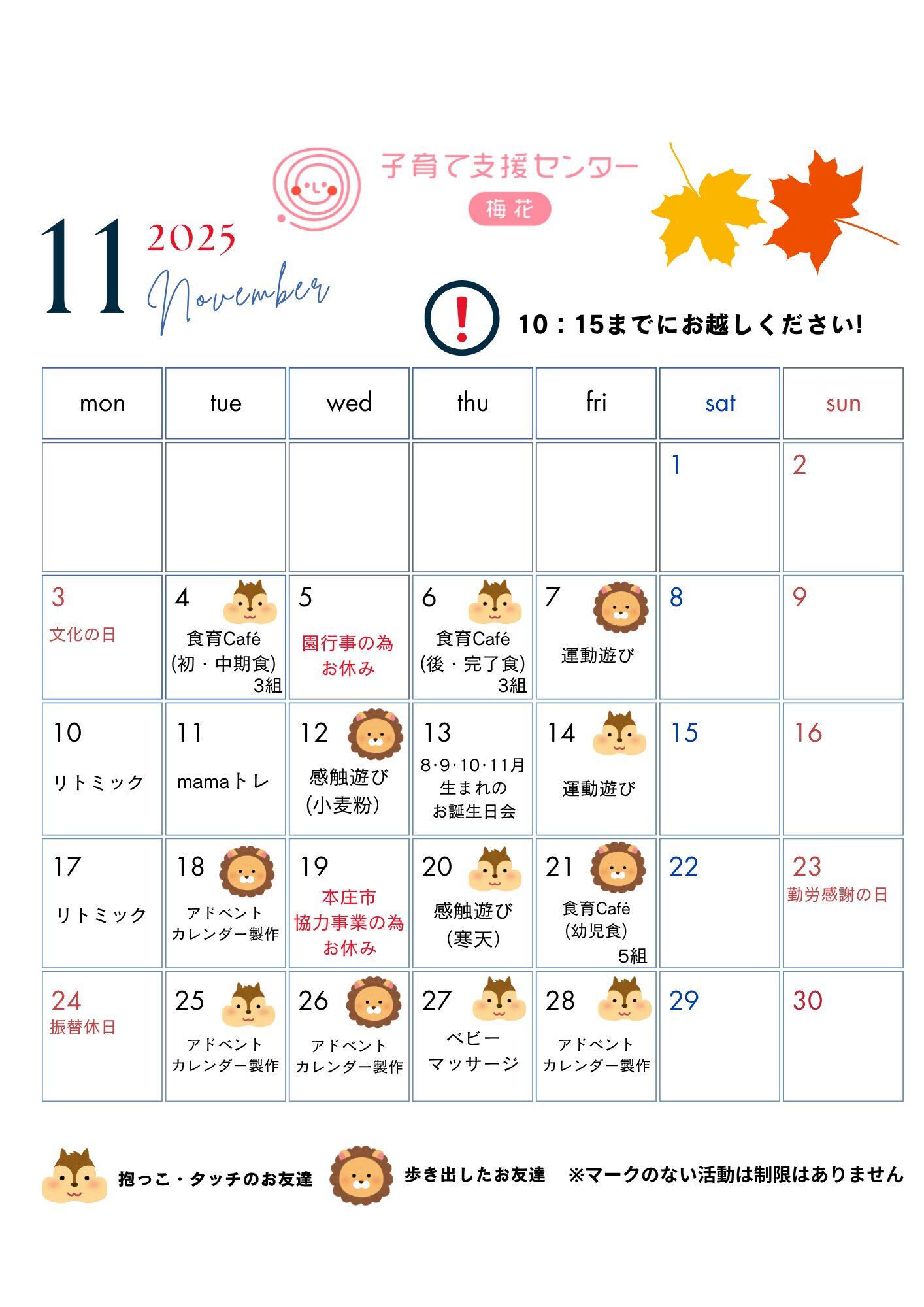 普段のお出かけに必要なものを持参ください。 使用済のおむつは支援センター内ゴミ箱をご利用ください。 授乳が必要な方は授乳ケープをご持参ください |